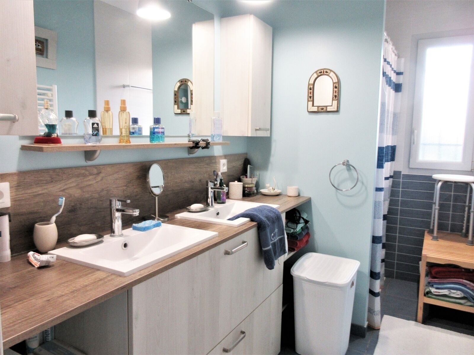 Elle se compose d’une pièce de vie de 41, 88 m² avec son espace cuisine ouverte de 6, 42 m², deux grandes porte-fenêtre, l’une donnant sur le côté de la maison exposé sud, l’autre sur le jardin arrière exposé ouest, un cellier buanderie de 4, 63 m² avec chauffe eau thermo dynamique, un dégagement de 4, 28 m² desservant la partie nuit avec des toilettes équipées d’un puits de jour, une chambre servant de bureau de 9, 73 m² avec placard, une deuxième avec placard de 10 m², une salle d’eau avec douche à l’italienne de 5, 156 m² et fenêtre oscillo-battante, une troisième chambre de 11, 3 m² avec placard et une porte donnant accès au garage pouvant être transformé en quatrième chambre.