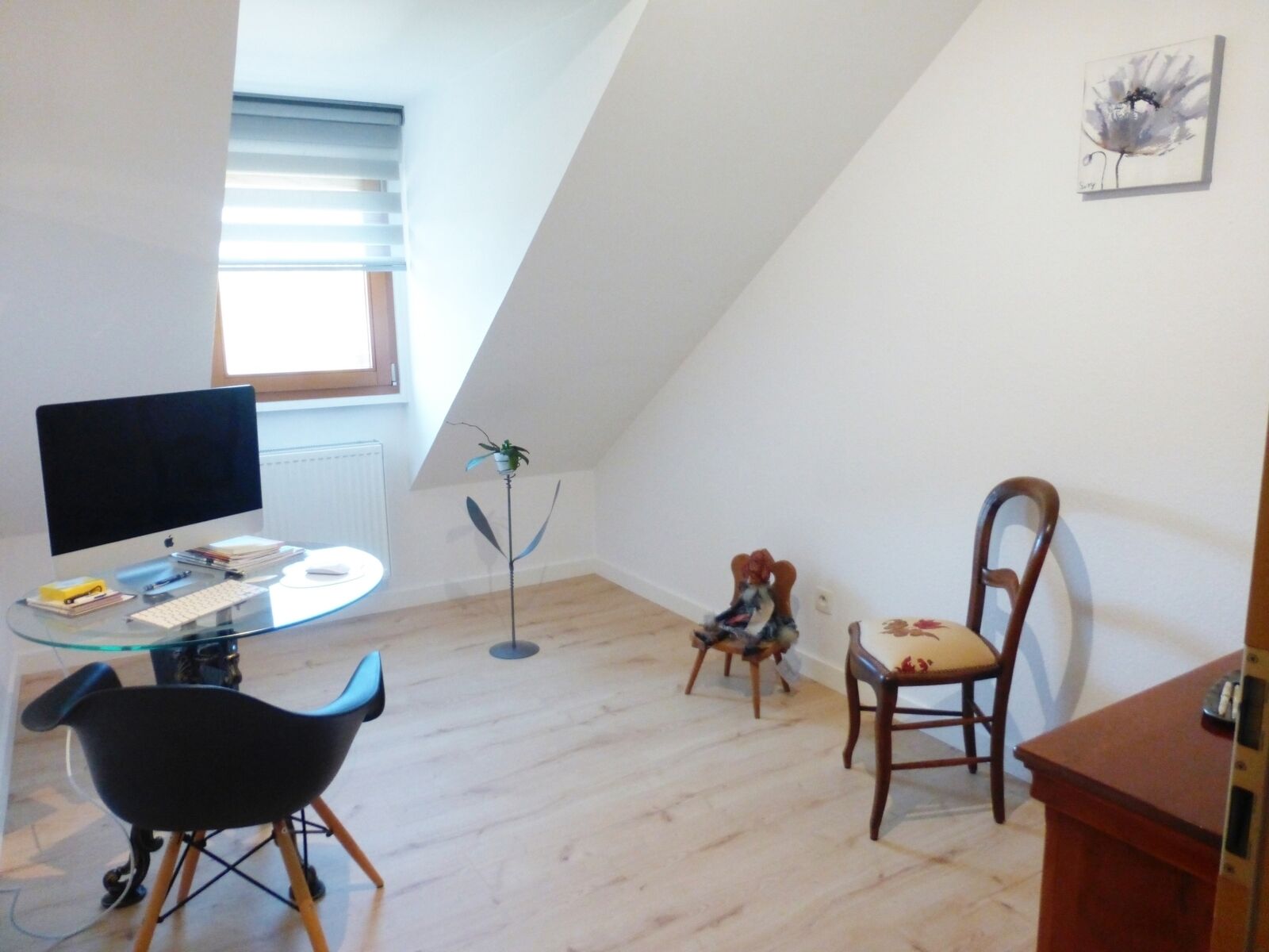 Cet appartement moderne et chic a été entièrement rénové récemment par des professionnels. On y retrouve des matériaux de qualité : parquets, murs en béton ciré, enduits à la chaux, mur de cuisine en stratifié, placard de rangement en bois massif... Il est raccordé à la fibre.