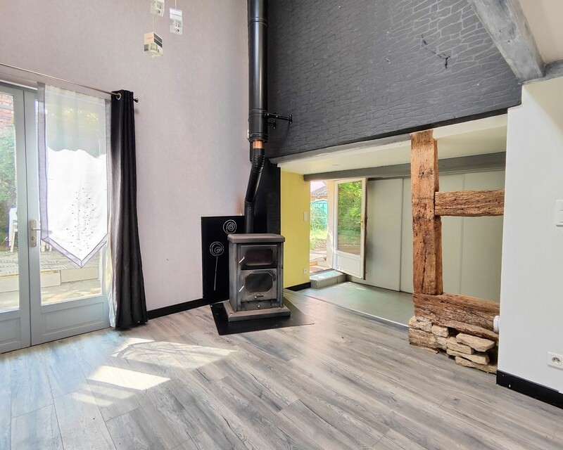 - au rez-de-chaussée : dégagement avec placard mural, salle à manger ouverte sur la cuisine, salon avec poêle à bois, un wc indépendant