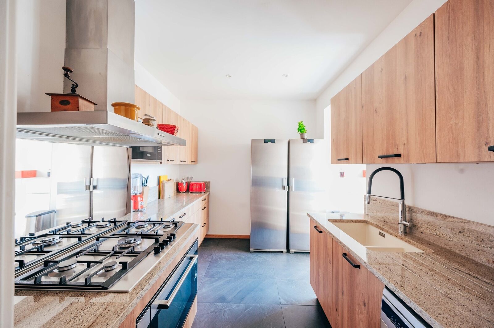 Une fois la porte franchie, on arrive dans une entrée spacieuse attenante à une pièce de vie conviviale, avec accès au balcon et une vue dégagée orientée ouest. Côté sud, une cuisine indépendante et contemporaine, soigneusement équipée, plus un coin buanderie avec accès à l'ascenseur de service et WC séparé.
