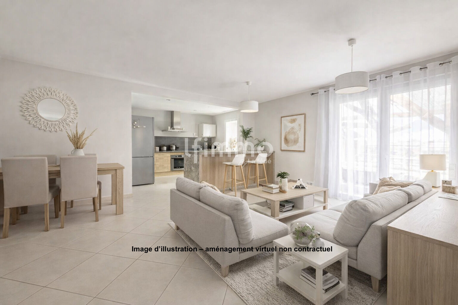 La cuisine semi-ouverte et équipée s’intègre harmonieusement à l’espace de vie.