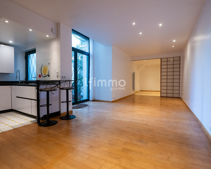 Sur un espace d'un seul tenant très bien agencé, une grande pièce de vie s'ouvre sur la cour exposée sud avec une belle chambre attenante séparée par une cloison amovible et une cuisine ouverte entièrement équipée et très fonctionnelle.