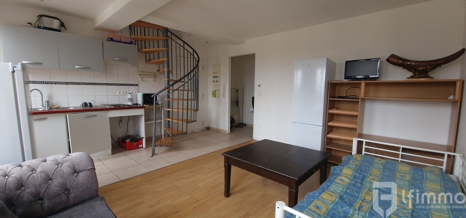 Au troisième étage sans ascenseur, l'entrée s'ouvre sur un séjour lumineux de 22 m² avec cuisine ouverte, une chambre et une salle d'eau.