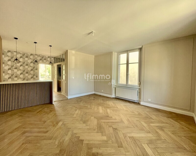 Vaste et lumineuse, sa pièce de vie, avec sa hauteur sous plafond et ses moulures, vous offre un cachet unique, elle est ouverte sur la cuisine pour plus de convivialité.