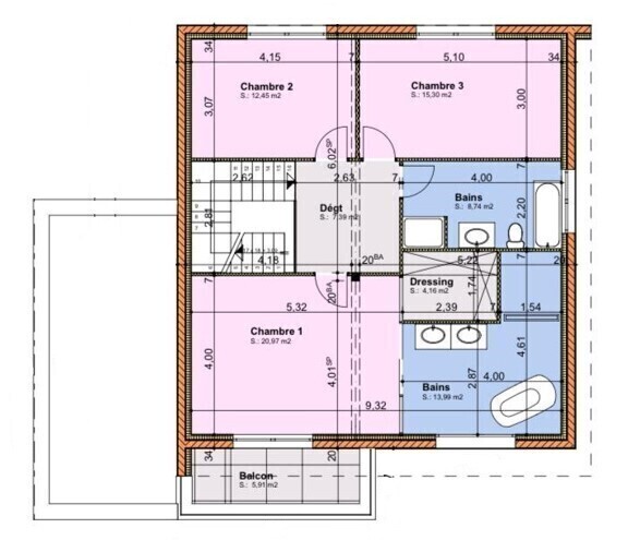 L’étage se compose d’un palier desservant deux chambres, une salle d’eau avec WC, ainsi qu’une spacieuse suite parentale de 21 m². Cette dernière bénéficie de sa propre salle de bain de 14 m² et d’un dressing de 4 m², offrant un espace nuit confortable.