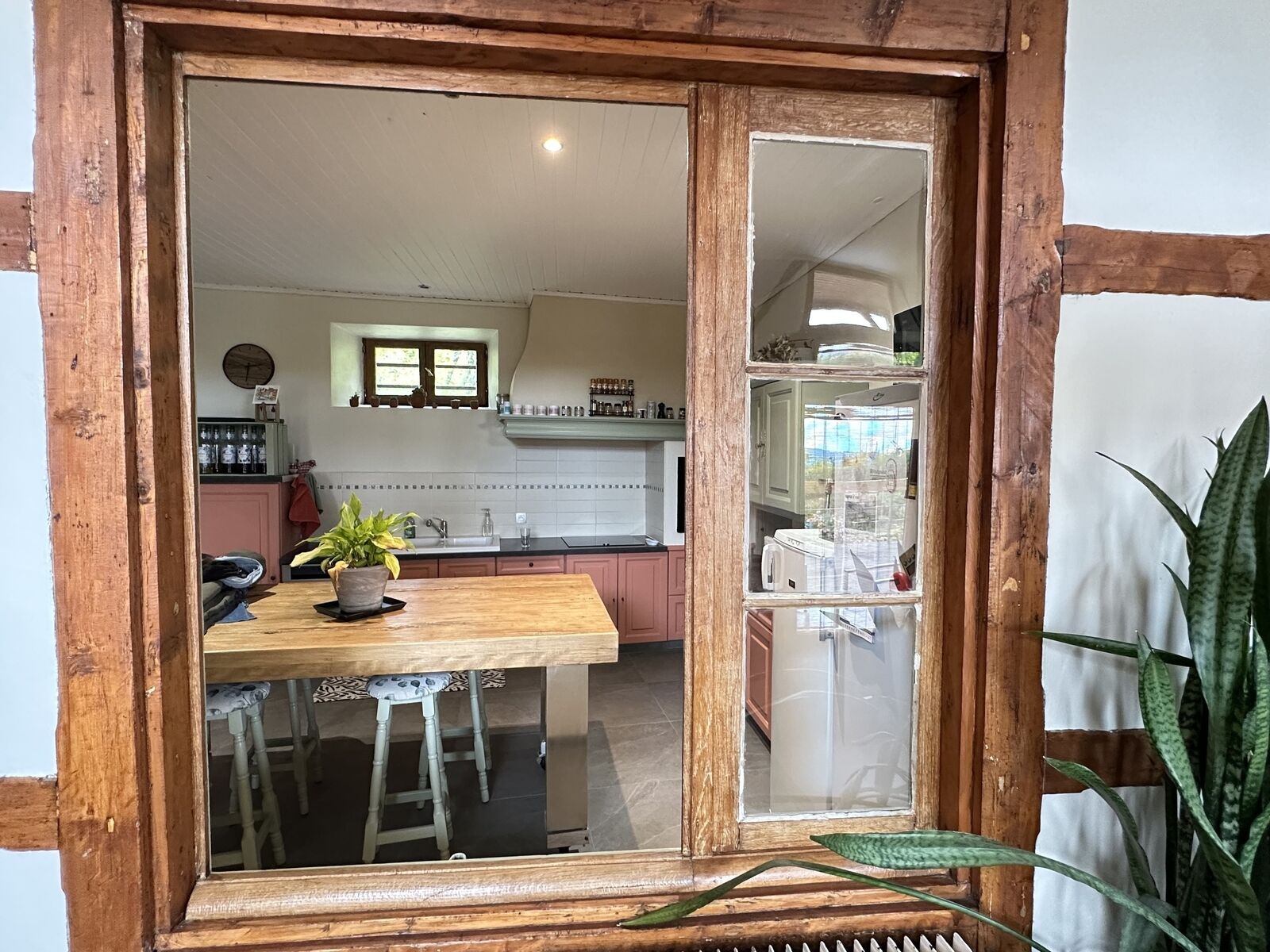 D'un coté cette belle maison alsacienne comprenant au rez- de -chaussée une cour intérieur, des caves, garage et ateliers puis en montant un escalier extérieur, nous avons la partie habitation sur 1 niveau : 1 hall d'entrée qui va desservir la cuisine entièrement équipée, 1 beau et grand salon-séjour, 3 grandes chambres et cette belle salle de bain totalement carrelée et aménagée( baignoire, douche, wc). Une terrasse de 50 m² donnant sur le village et le vignoble.