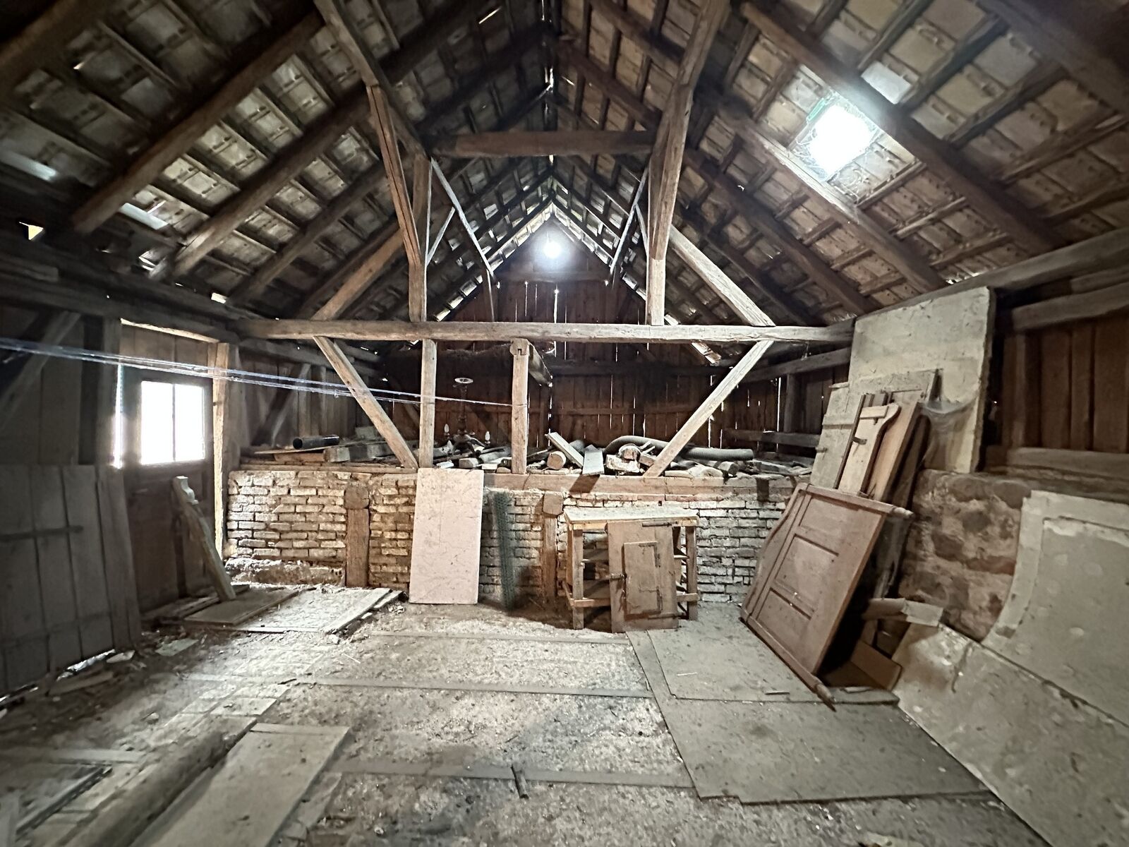 En passant par le second portail, nous arrivons dans une cour et une grange de 67 m² tout en poutres (état de la charpente excellent) à rénover qui va vous offrir de nombreuses possibilités d'aménagements mais également de grandes caves et espaces de stockage.