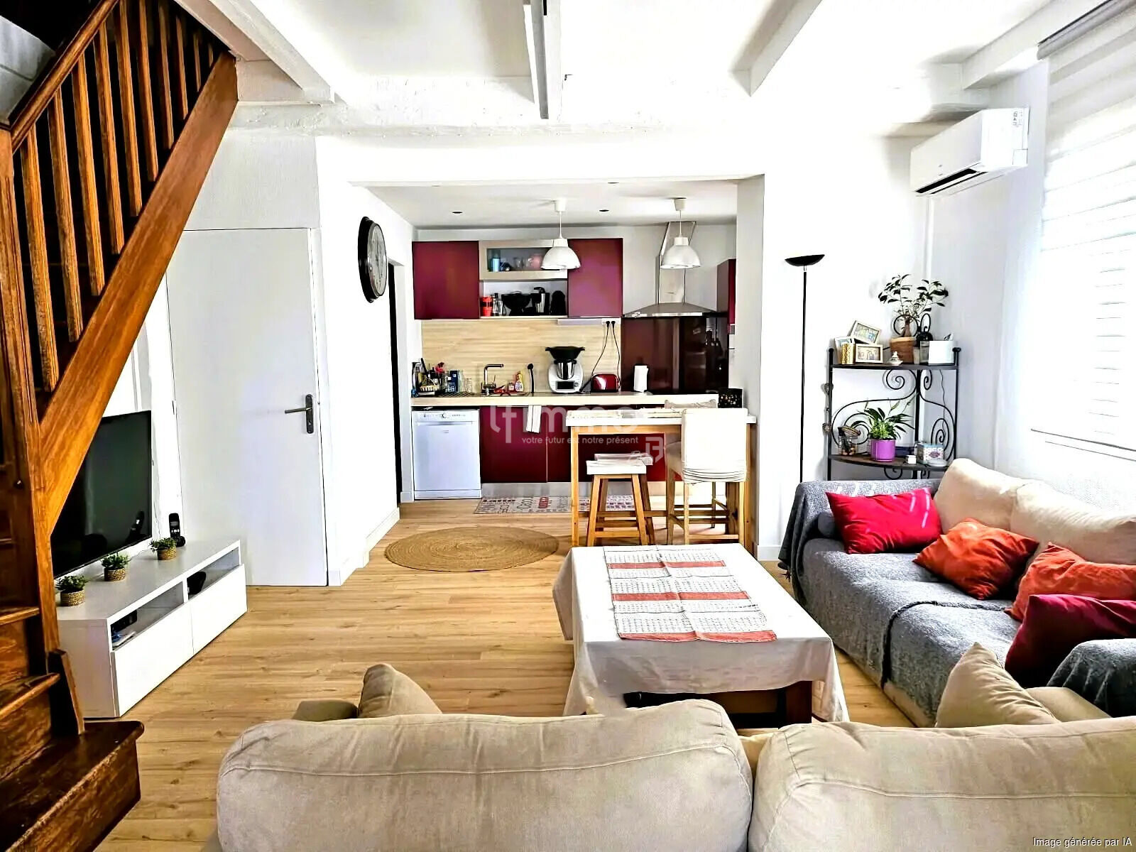 Le rez-de-chaussée accueille une belle pièce de vie traversante avec cuisine ouverte, des prestations de qualité et une climatisation réversible. Deux chambres se trouvent sur ce même niveau, dont une suite parentale. Une salle de bain supplémentaire et un WC séparé complètent l’espace. Un bureau, calme et lumineux, offre un cadre idéal pour le télétravail notamment.
