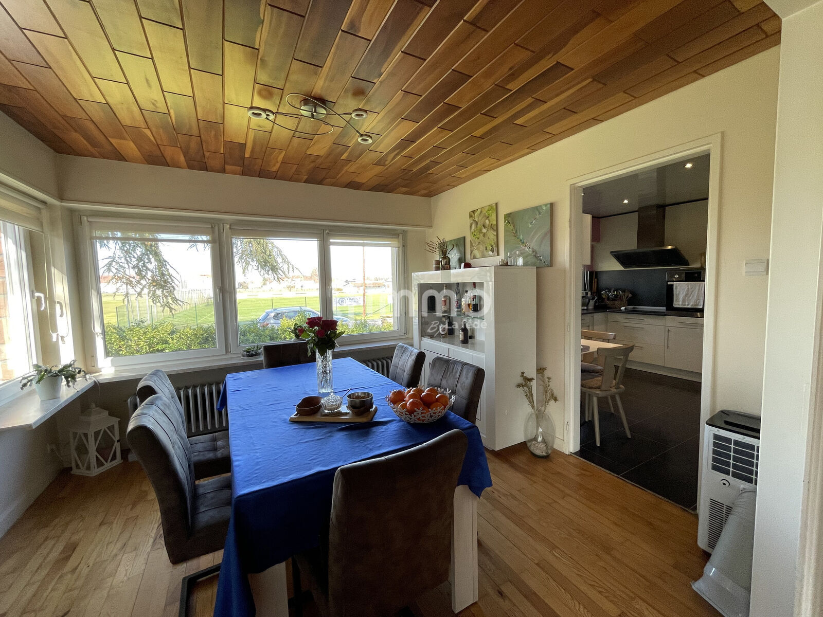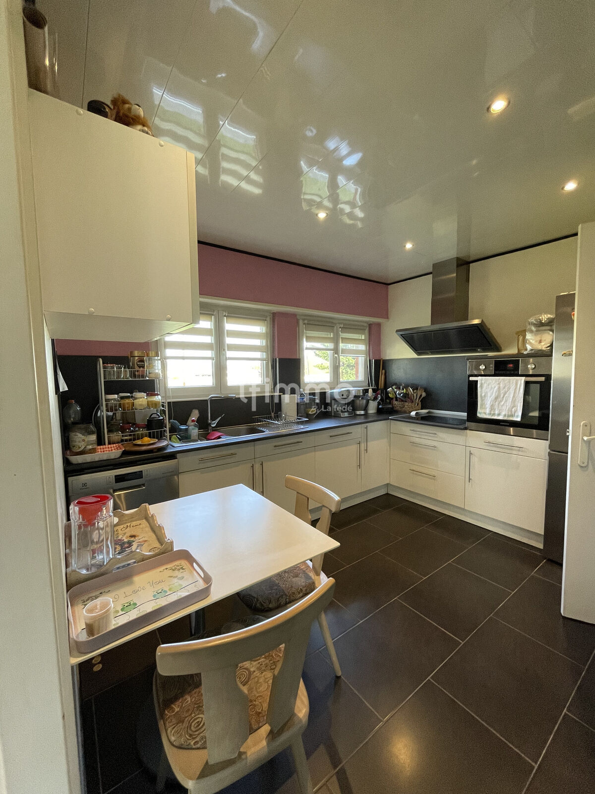 Entrée, cuisine équipée (four à Pyrolyse, plaques de cuisson à induction, combiné frigo/congélateur) avec coin repas, salle à manger attenante, salon