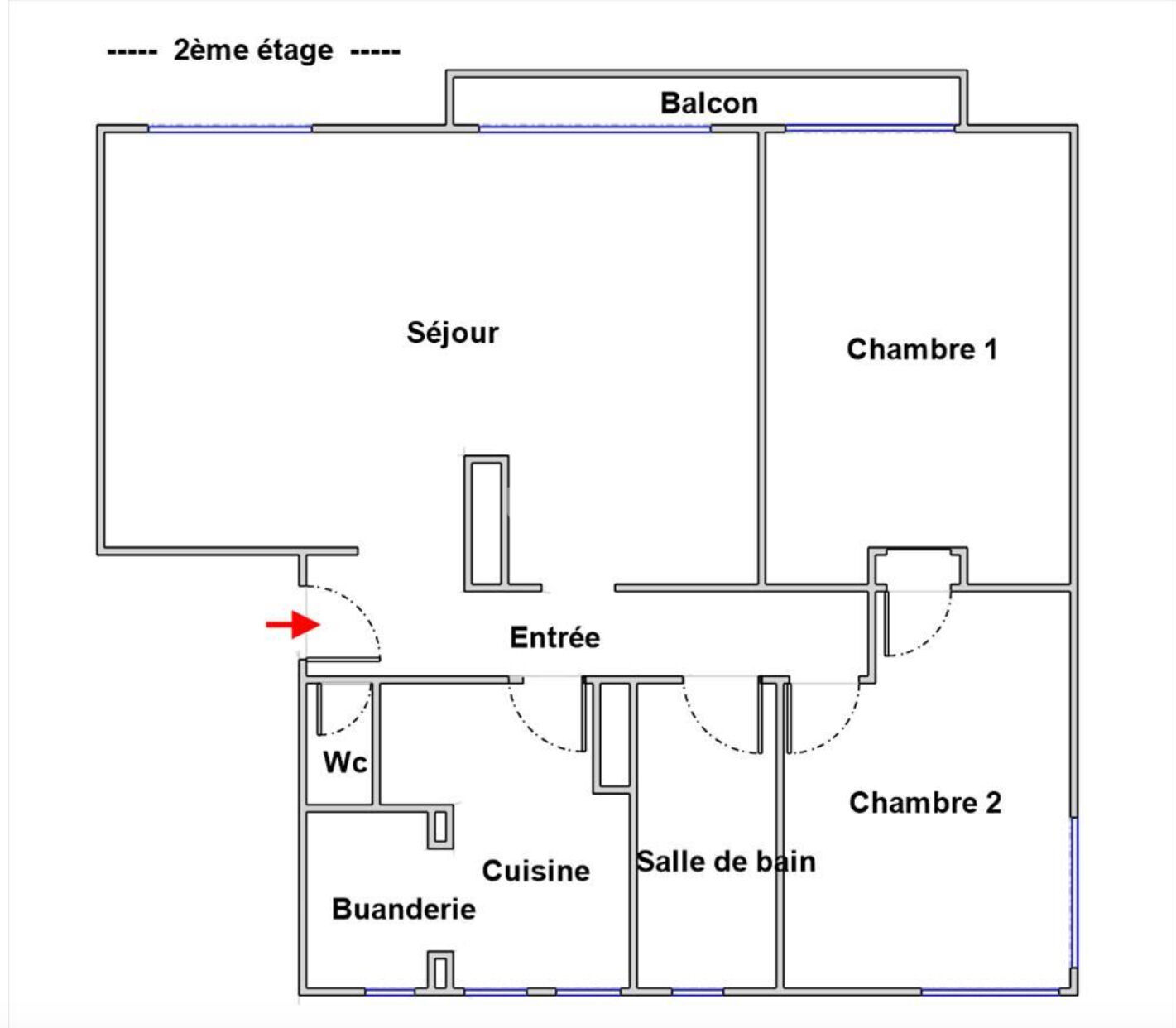 Une Entrée ouverte sur couloir dessert un spacieux Salon/Salle à Manger de 27m2, une Cuisine indépendante, une buanderie, une Salle de Bains, 2 Chambres, WC. (3ème chambre d'origine possible par la simple pose d'une cloison.)