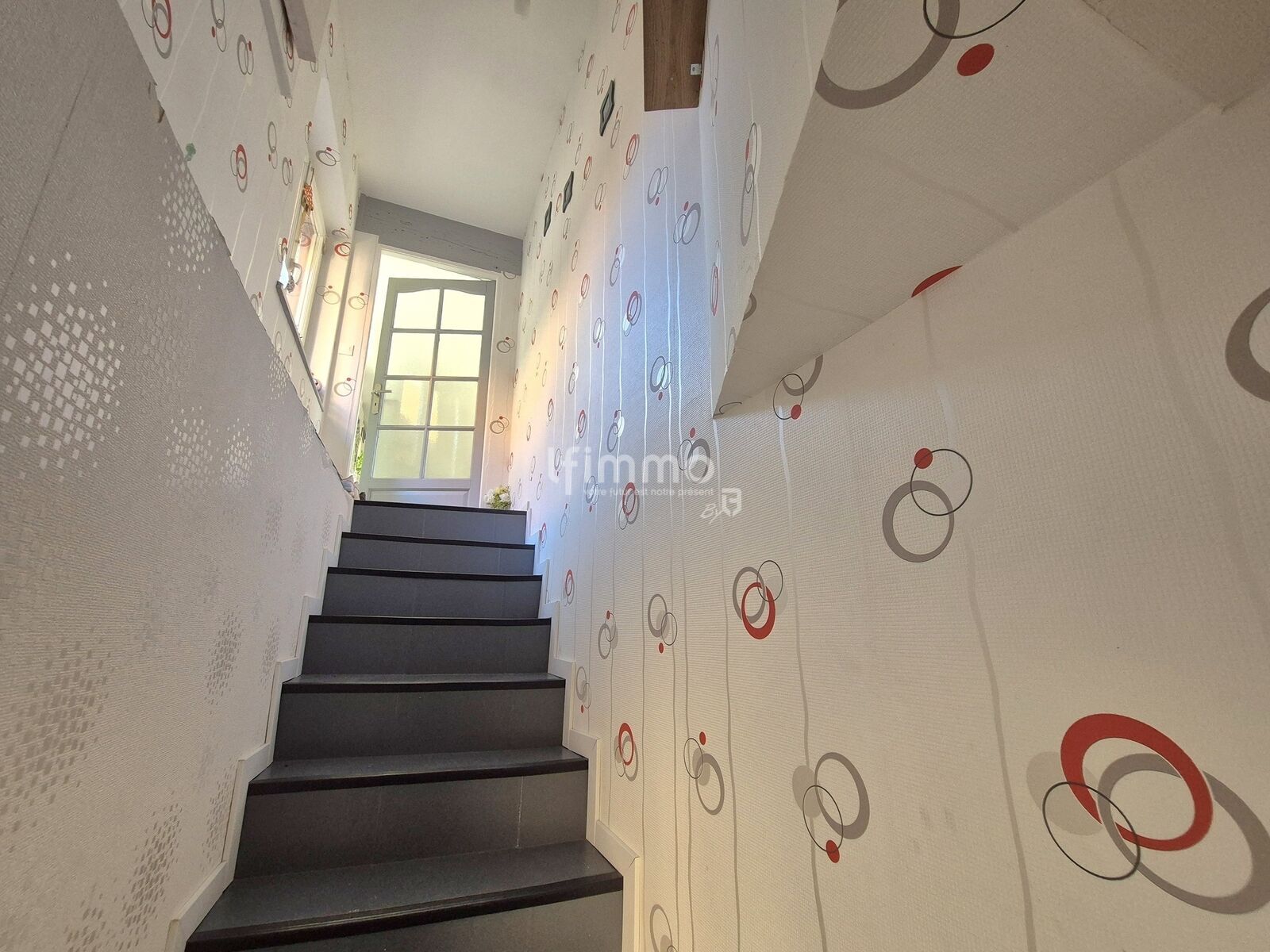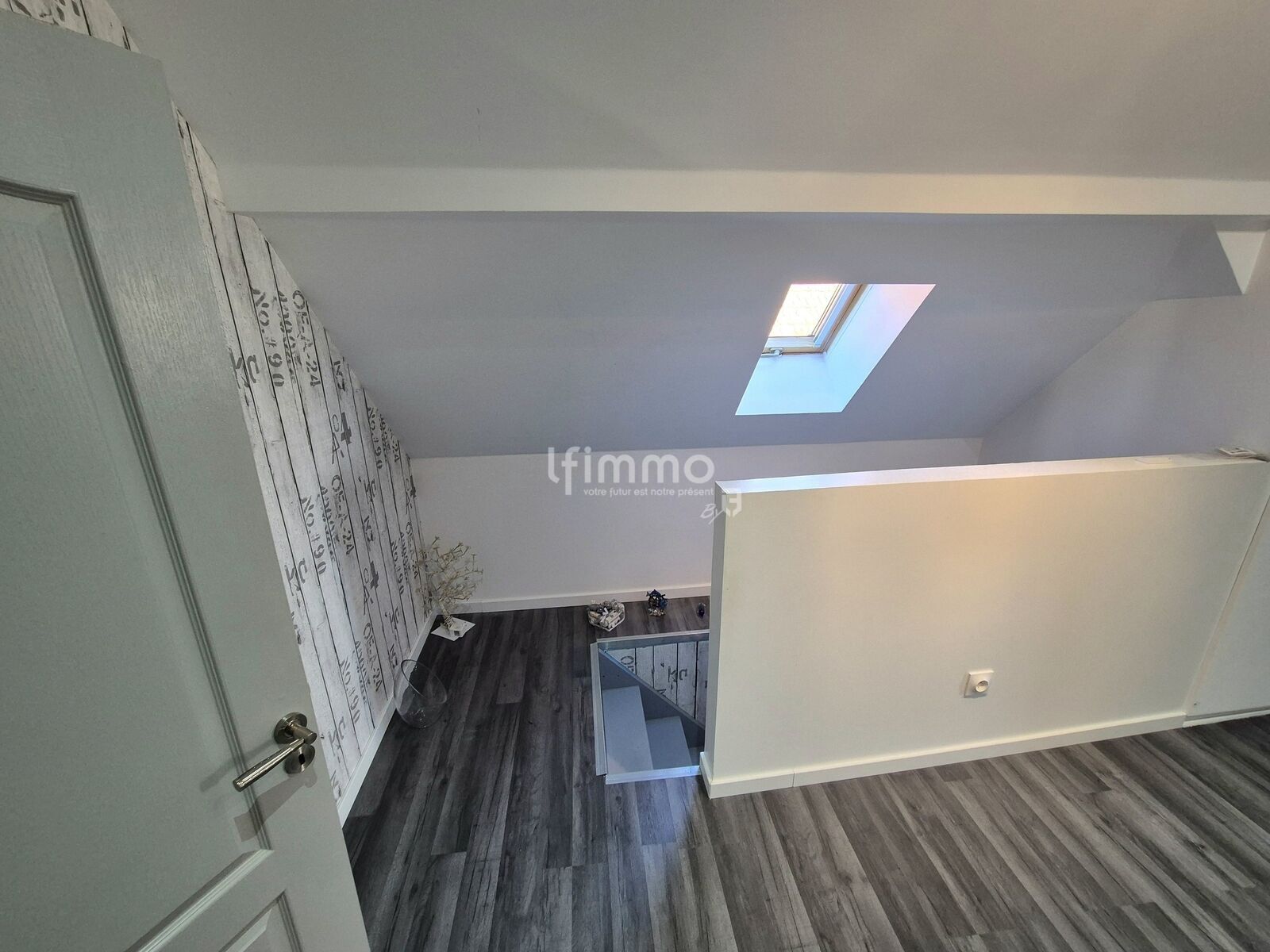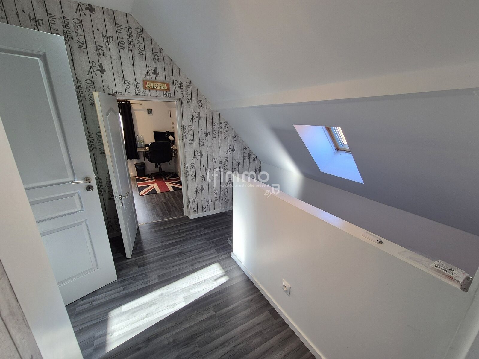au 1er étage: un lumineux salon-séjour de 27.84 m2 équipé d'un poêle à granules ouvert sur une cuisine équipée de 10.67 m2, un couloir de 5.90 m2, une pièce de 8.17 m2 pouvant être utilisée comme bureau, une salle de bains de 8.17 m2 équipée d'une baignoire et d'un wc.