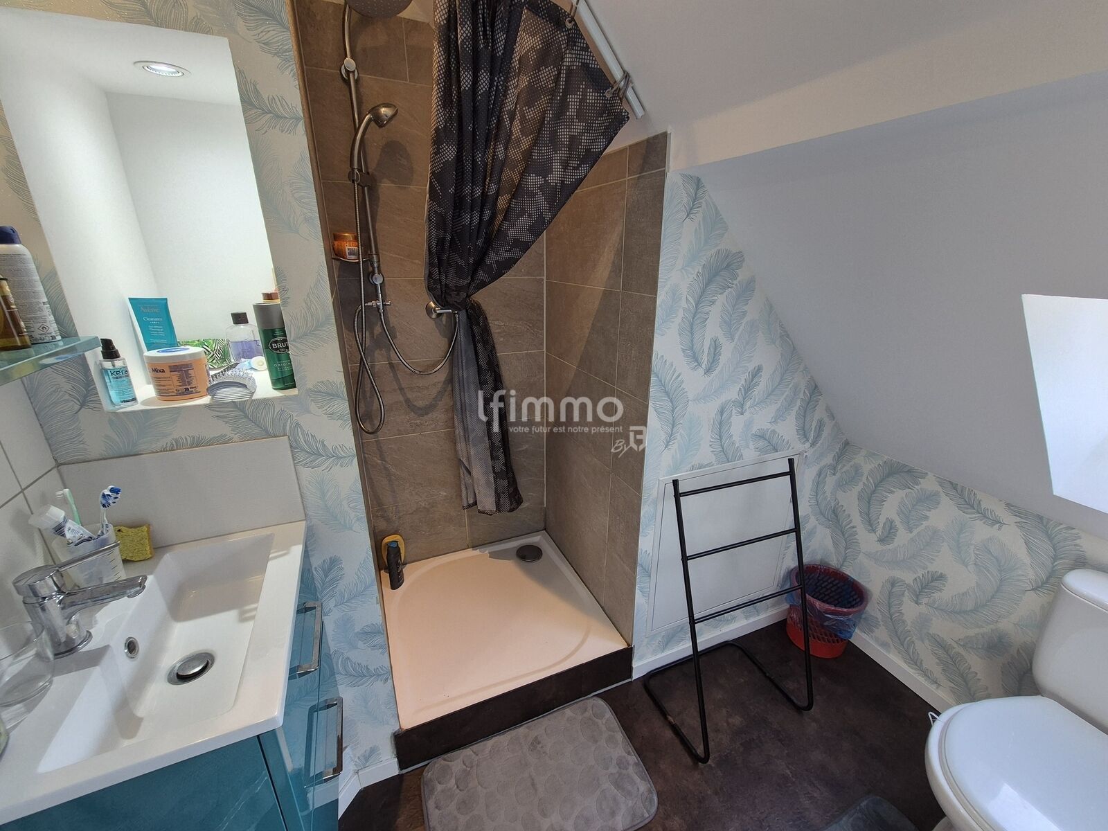 au 2ème étage: un palier de 6.96 m2 au sol, une chambre de 12.52 m2 au sol, une chambre de 18.87 m2 au sol et une magnifique salle d'eau de 4 m2 au sol équipée d'une douche, d'un toilette et d'un meuble avec évier et miroir.