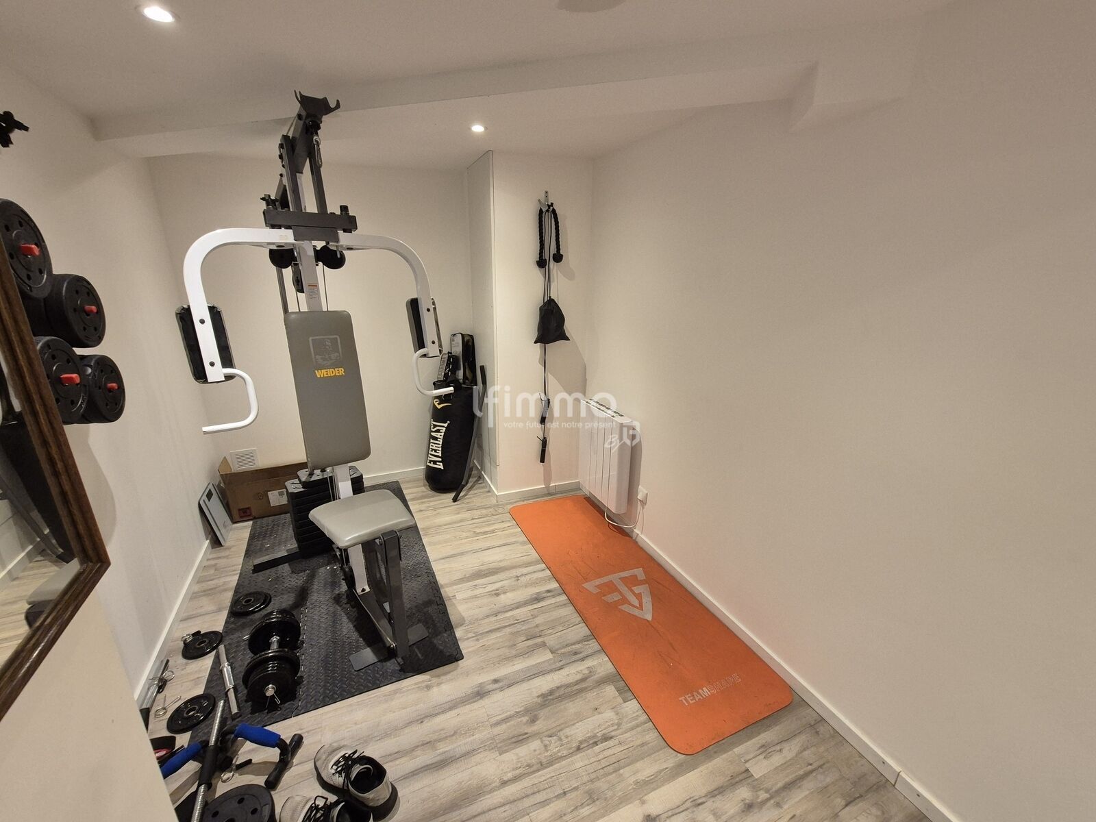 au rdc: une entrée de 1.98 m2, un dégagement de 5.27 m2, une salle de sport de 8.95 m2, une cave de 10.13 m2 et un garage de 21.86 m2.