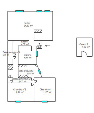 D’une surface de 64,27 m², il se compose d’une entrée, d’une cuisine séparée, d’une salle à manger ouverte sur un salon lumineux (exposition Nord, côté rue), d’un couloir avec rangements, de deux chambres exposées Sud sans vis-à-vis, et d’une salle d’eau avec WC.