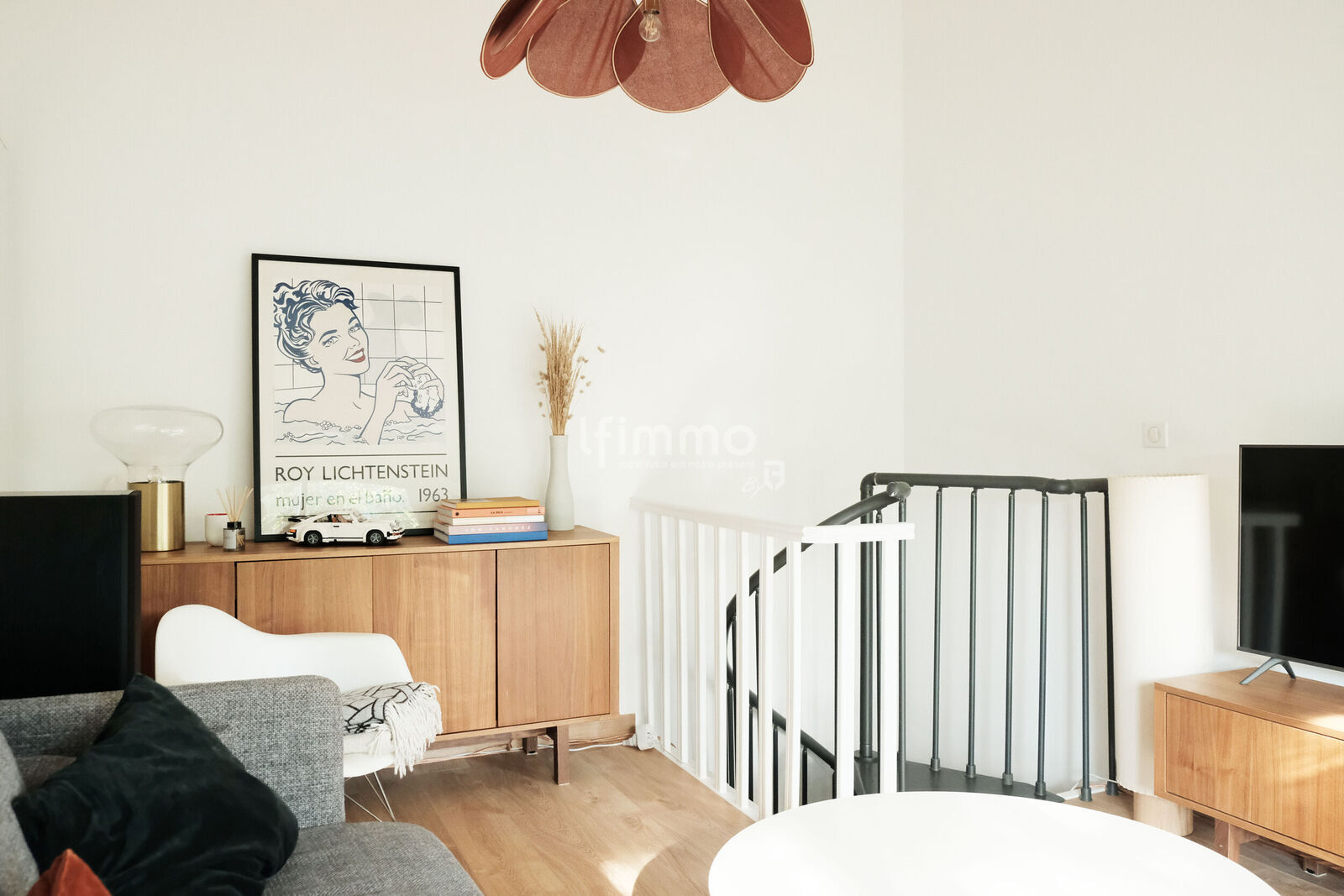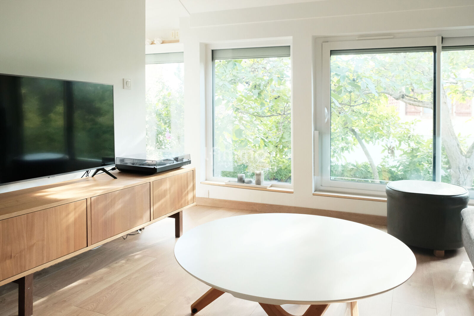 Au rez-de-chaussée surélevé, l'entrée distribue une cuisine dinatoire entièrement aménagée, un espace salon atypique en duplex baigné de lumière, avec baies vitrées et accès direct de plain pied au jardin, une première chambre ou espace bureau ou salle à manger, selon vos besoins.