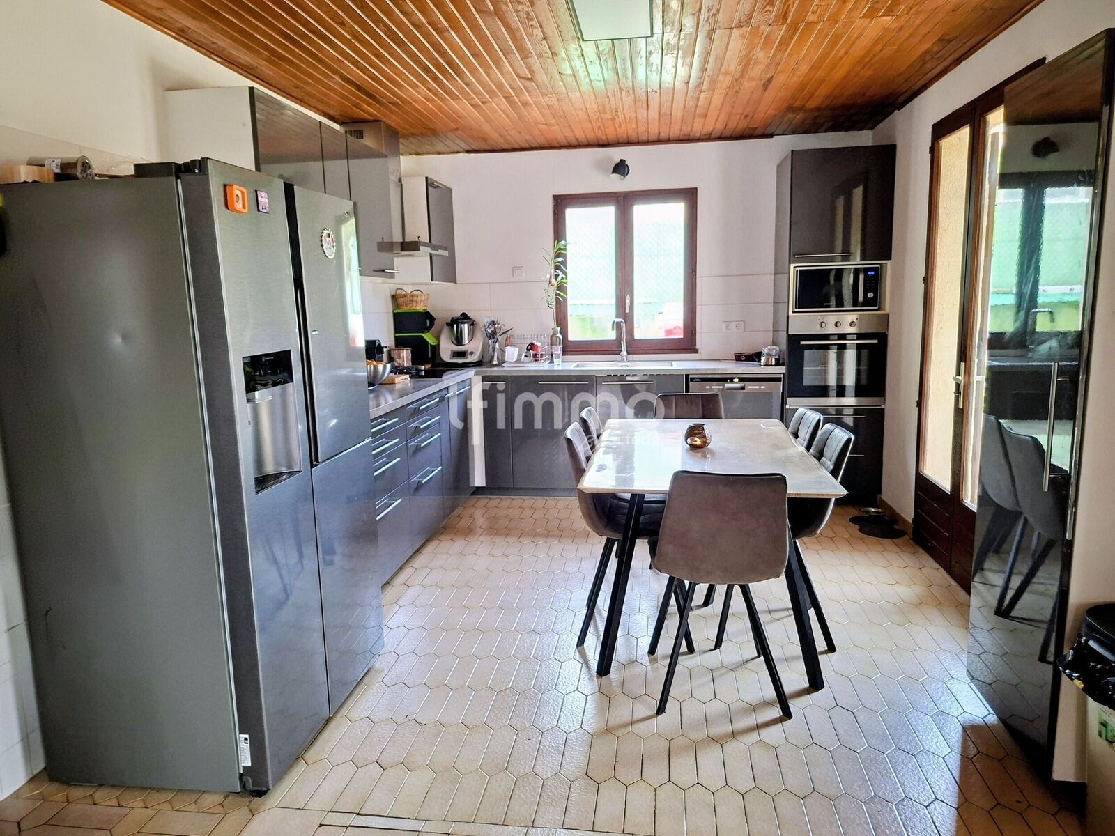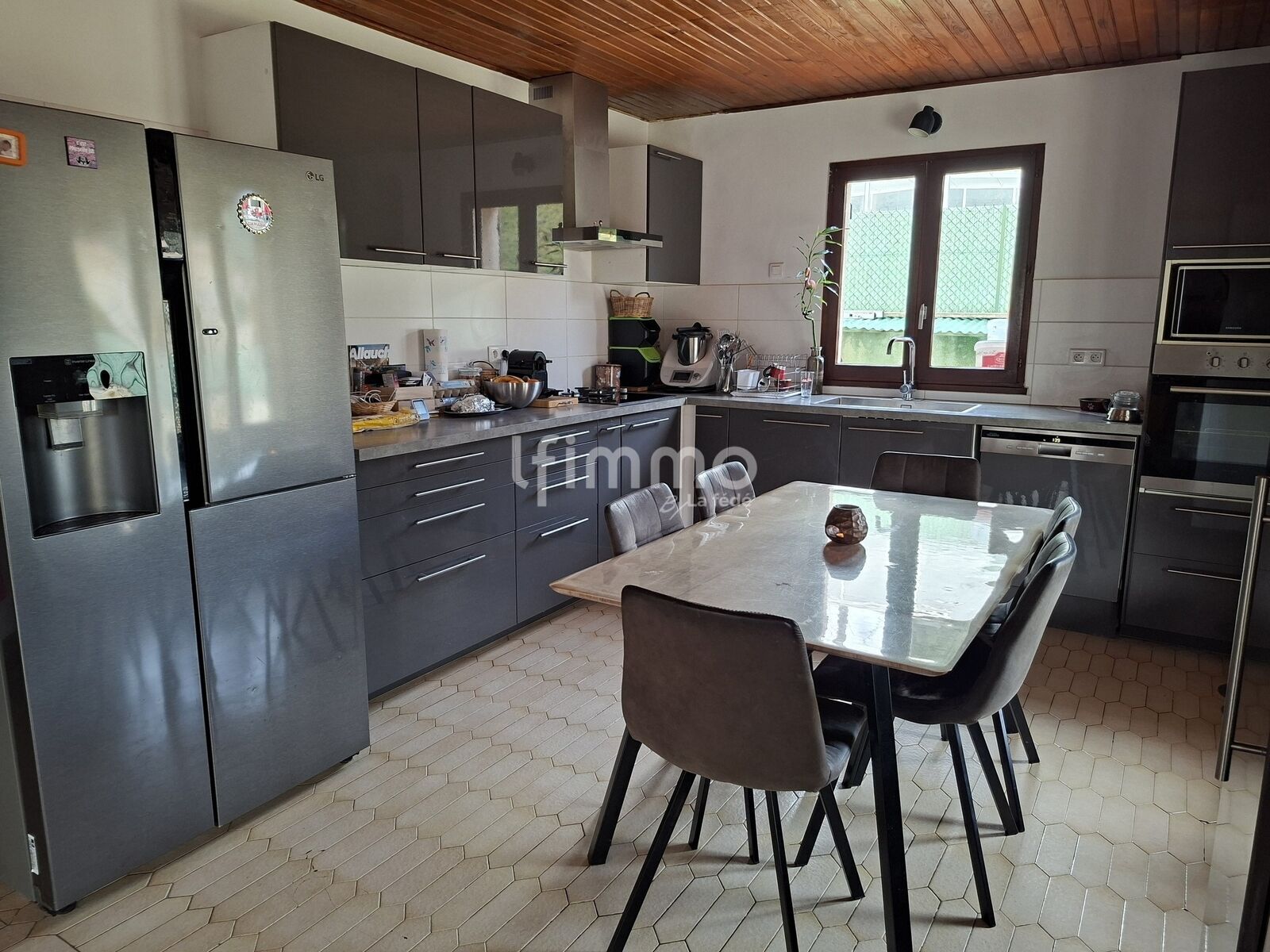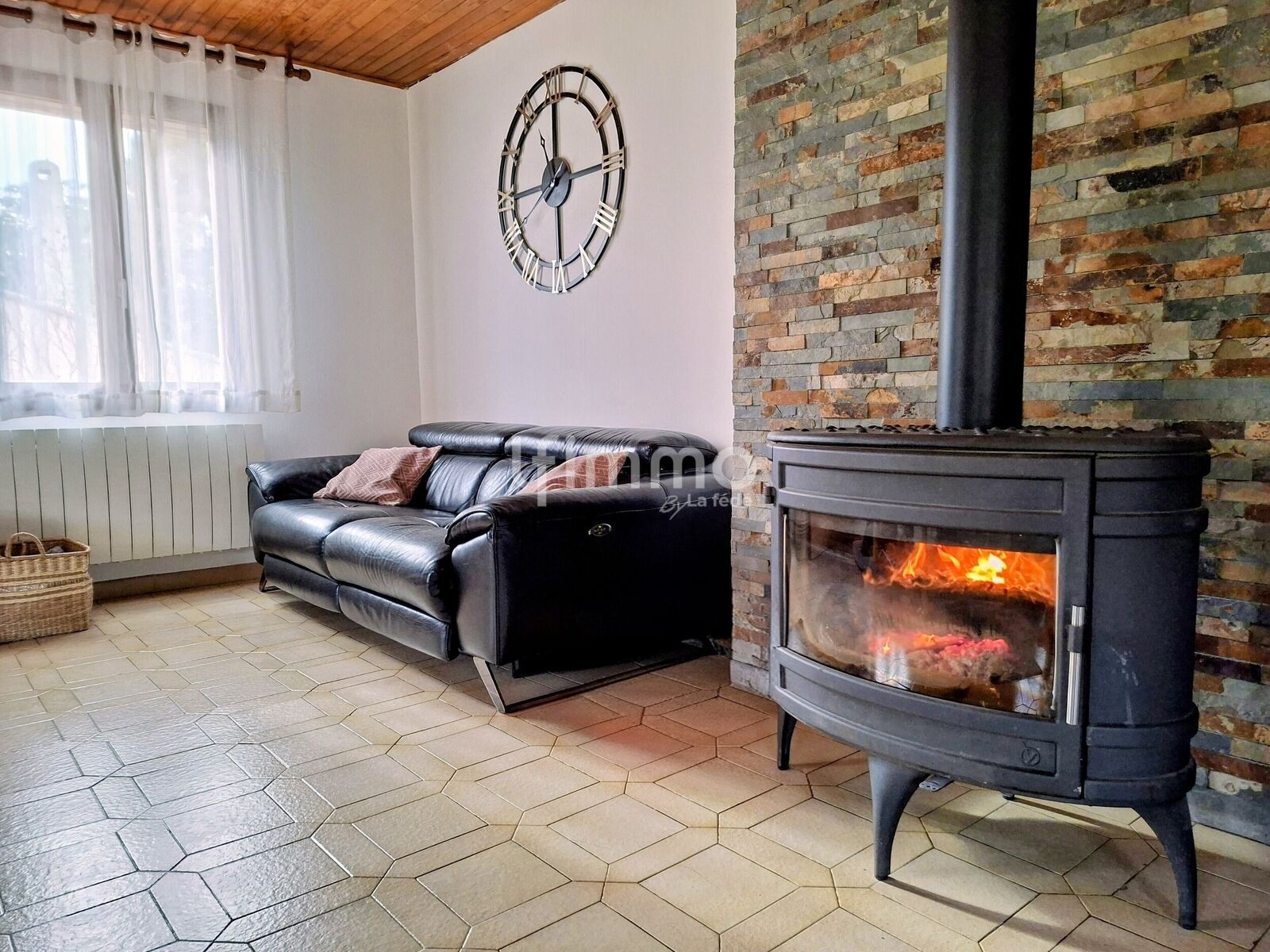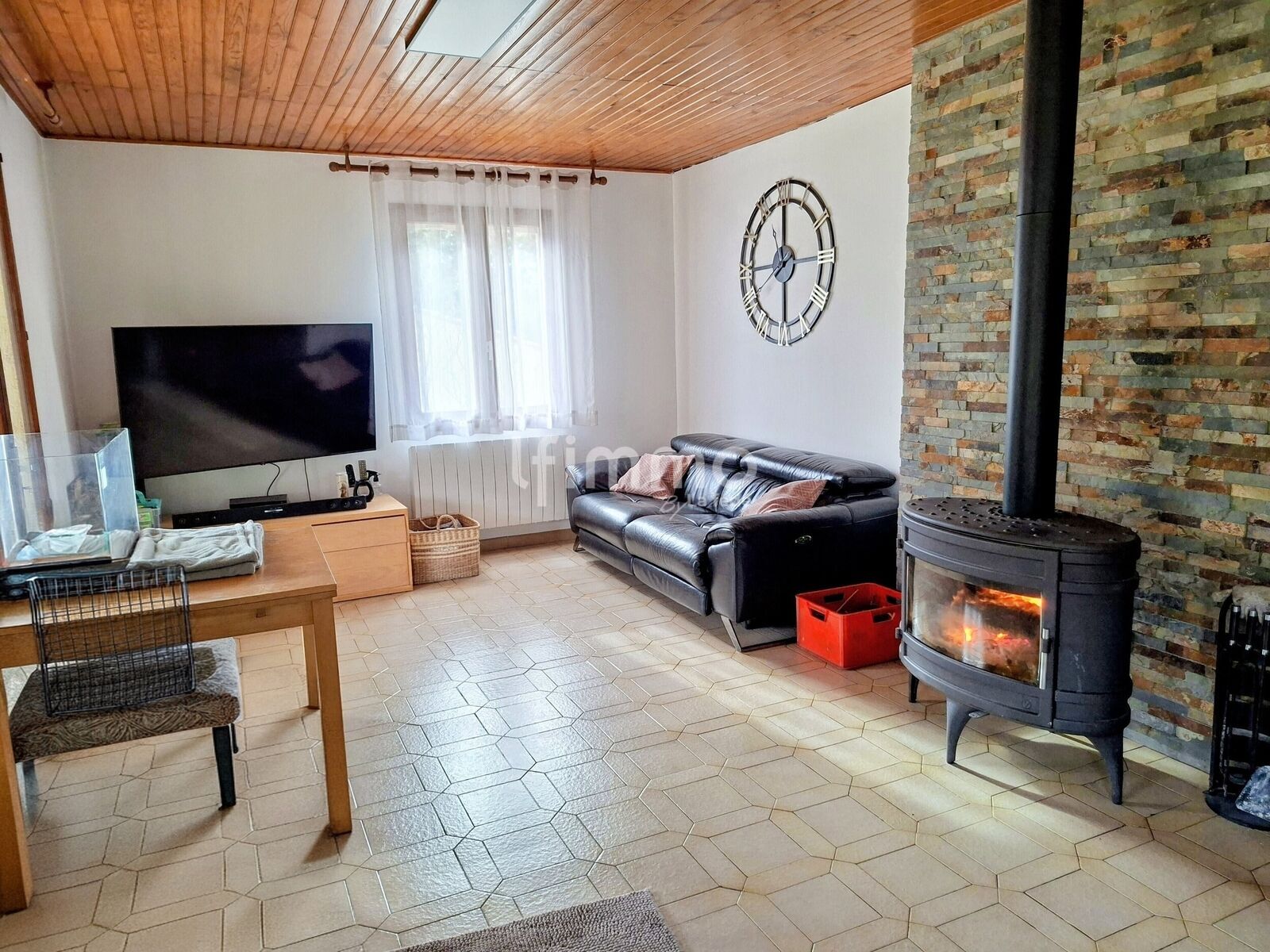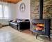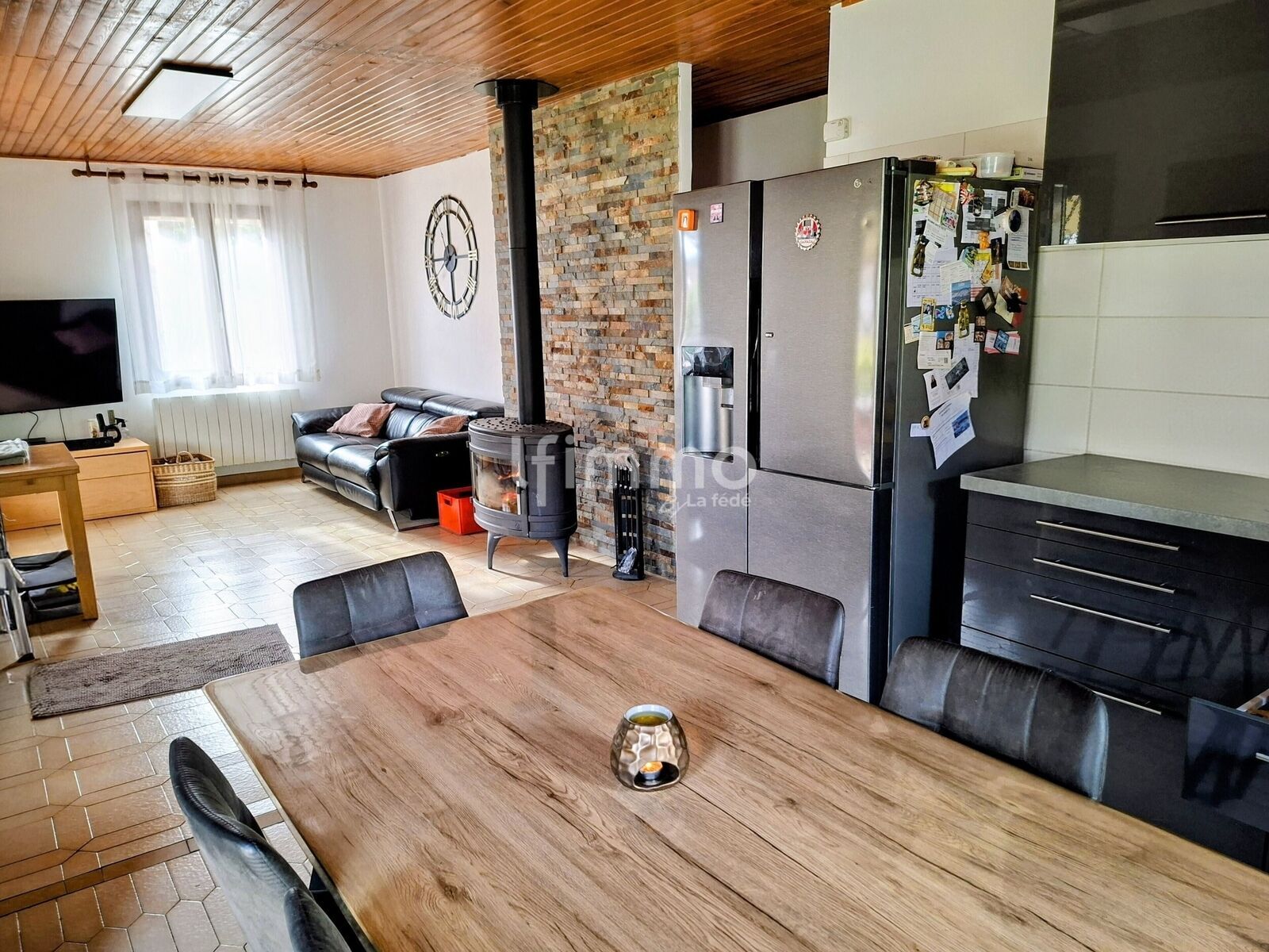 Le coin jour composé d'une belle piece à vivre avec poêle à bois central et une cuisine ouverte moderne toute équipée.
