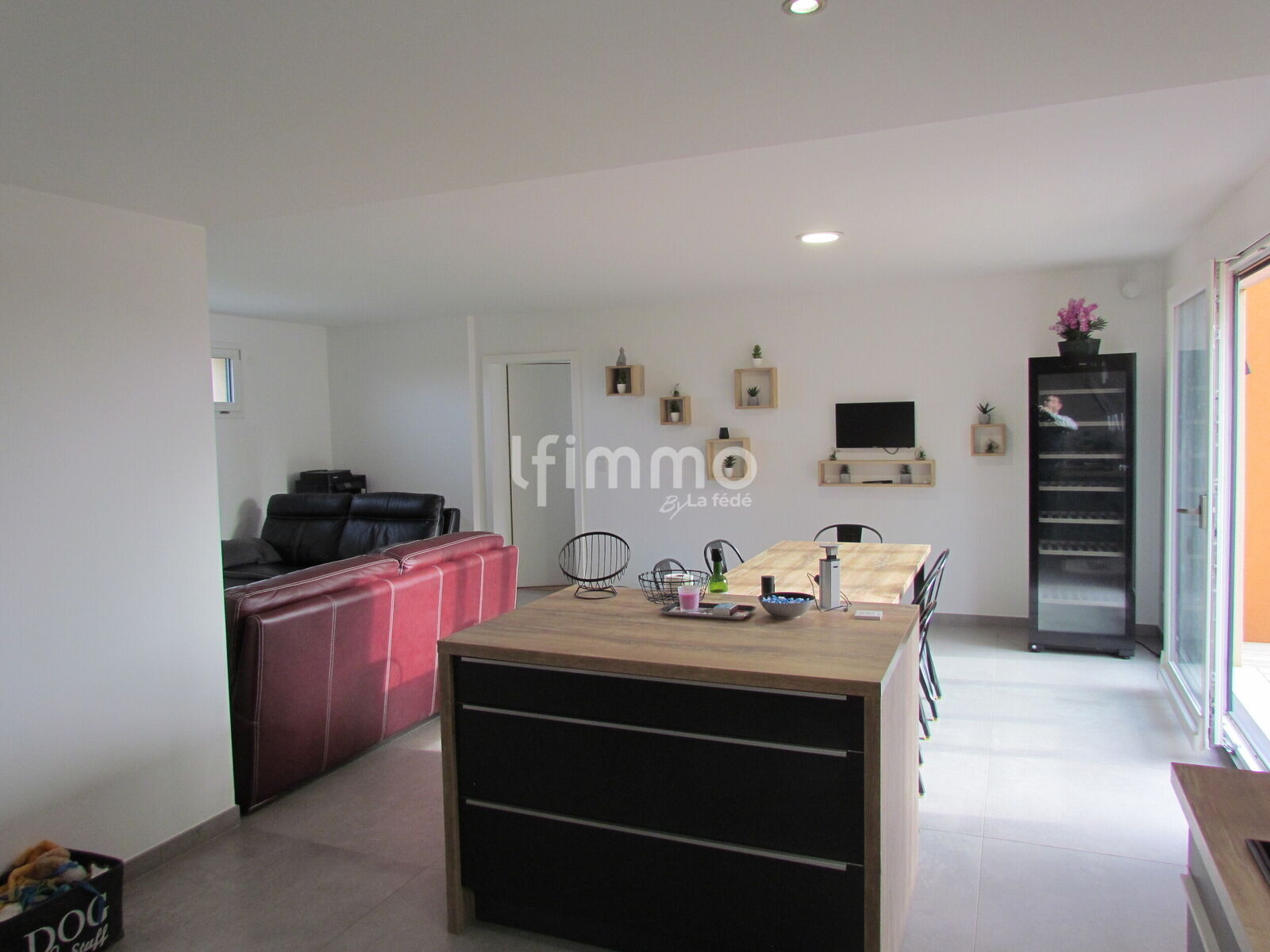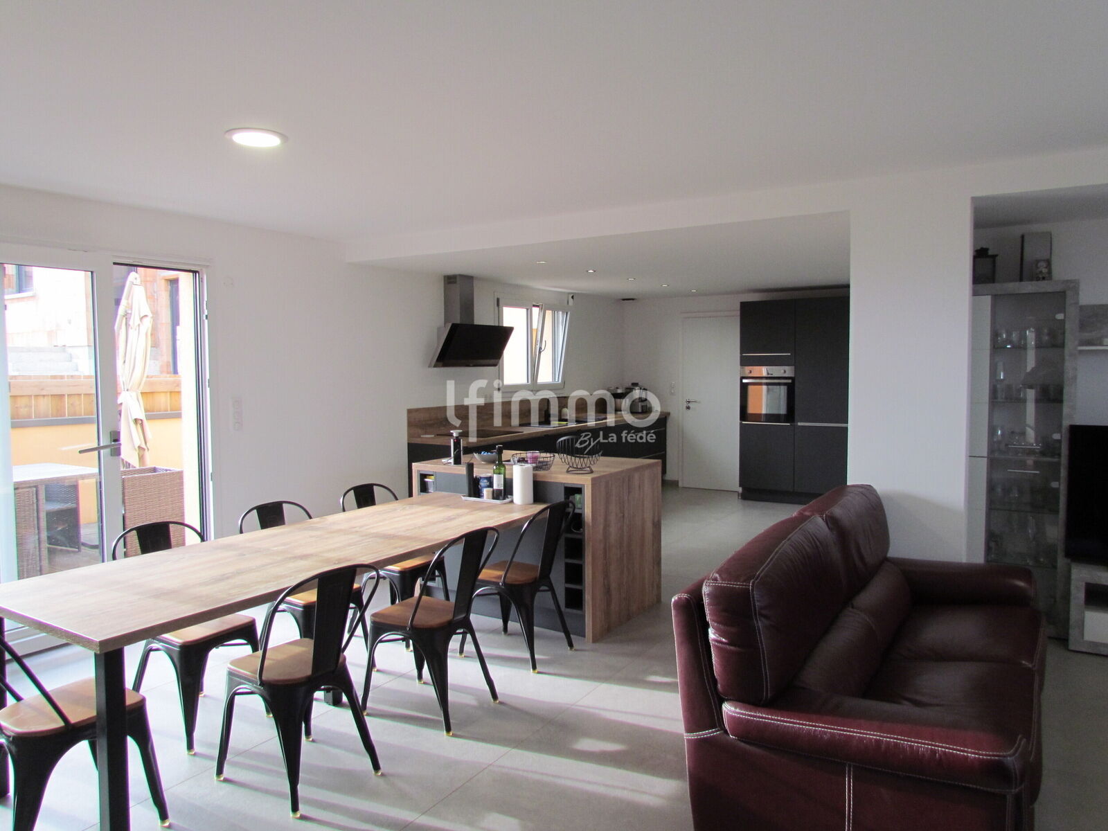 -Une grande pièce de vie ouverte avec une cuisine équipée, salle à manger/coin salon et accès sur la terrasse