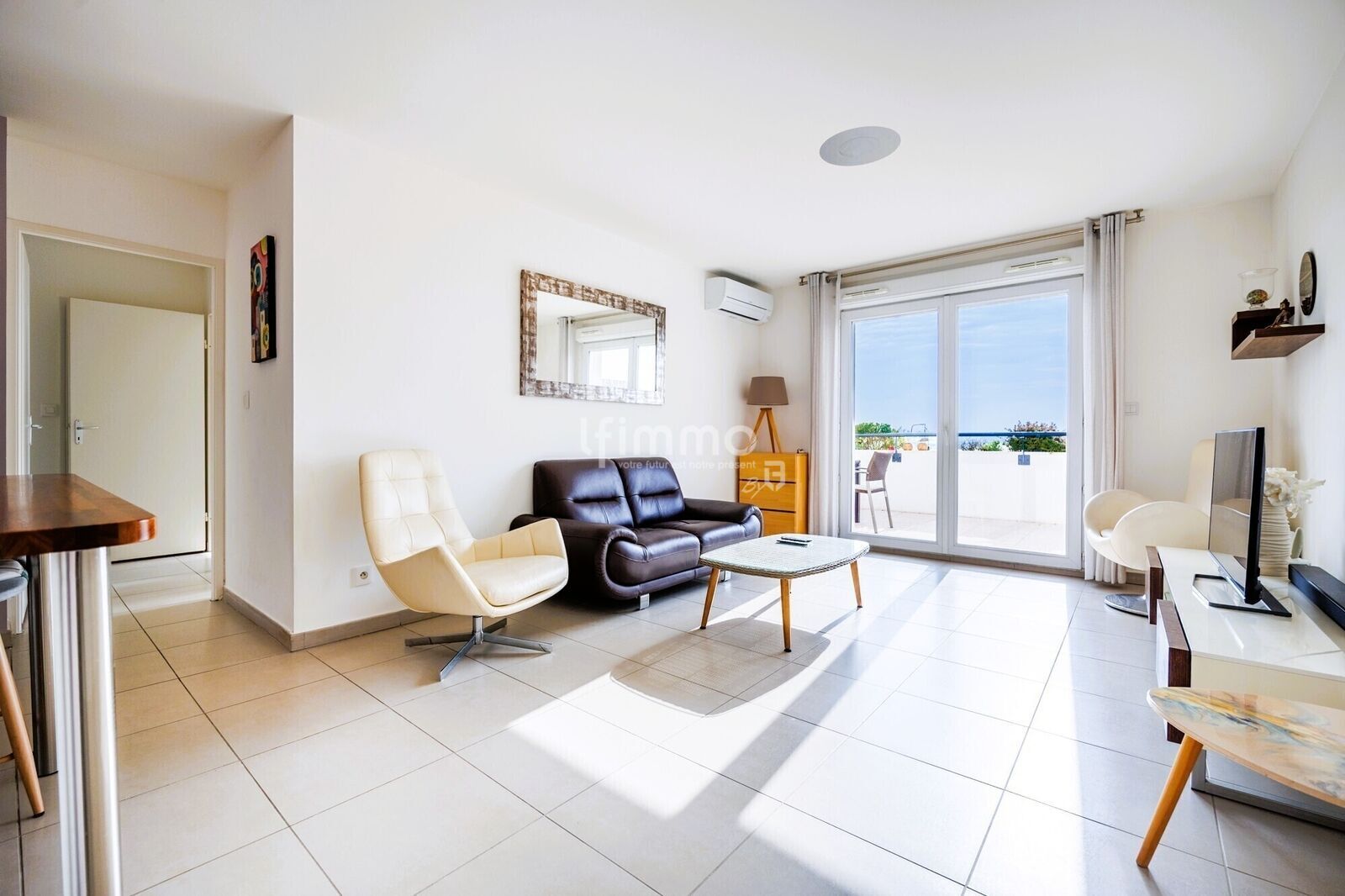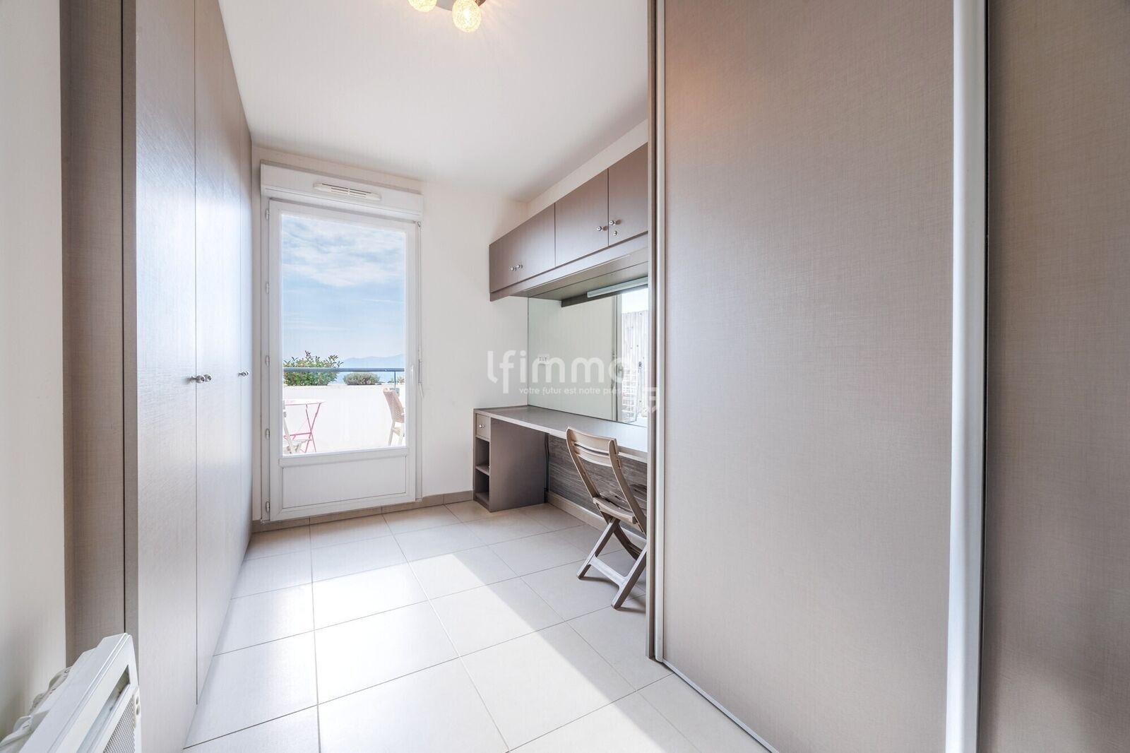 L’appartement prend place dans une résidence récente avec ascenseur. L’entrée se prolonge vers un salon lumineux avec une cuisine entièrement équipée, ne nécessitant aucun travaux. Le salon s’ouvre, par de larges baies vitrées, sur une large terrasse exposée plein sud, offrant une vue panoramique sur Marseille, sa baie et un agréable aperçu mer.