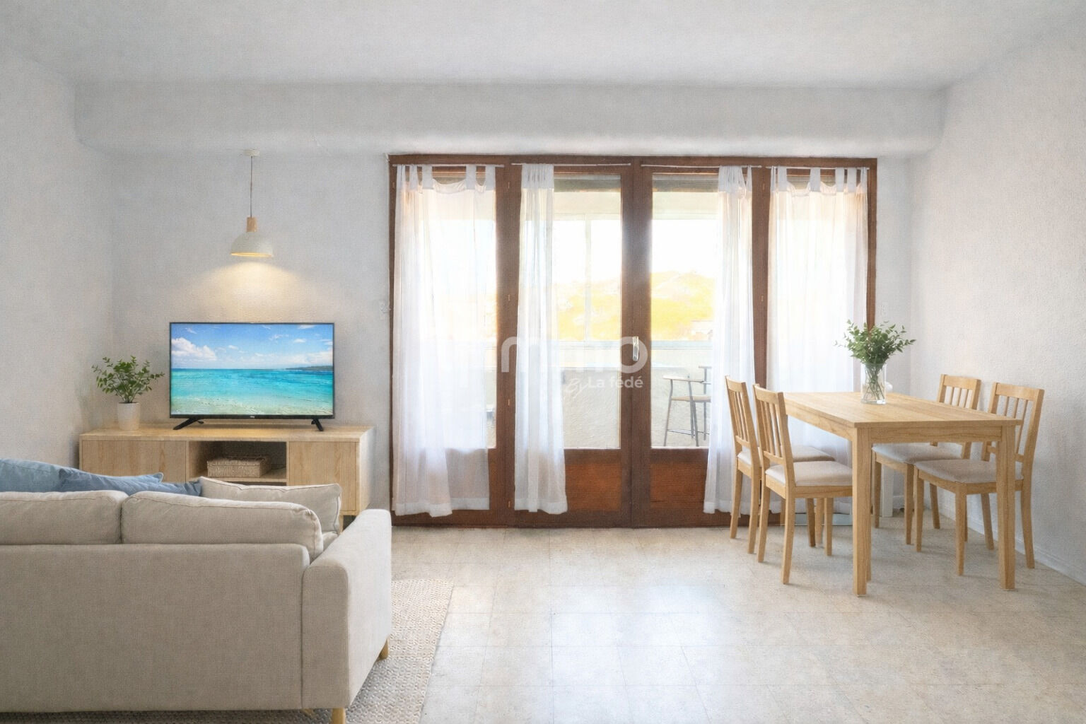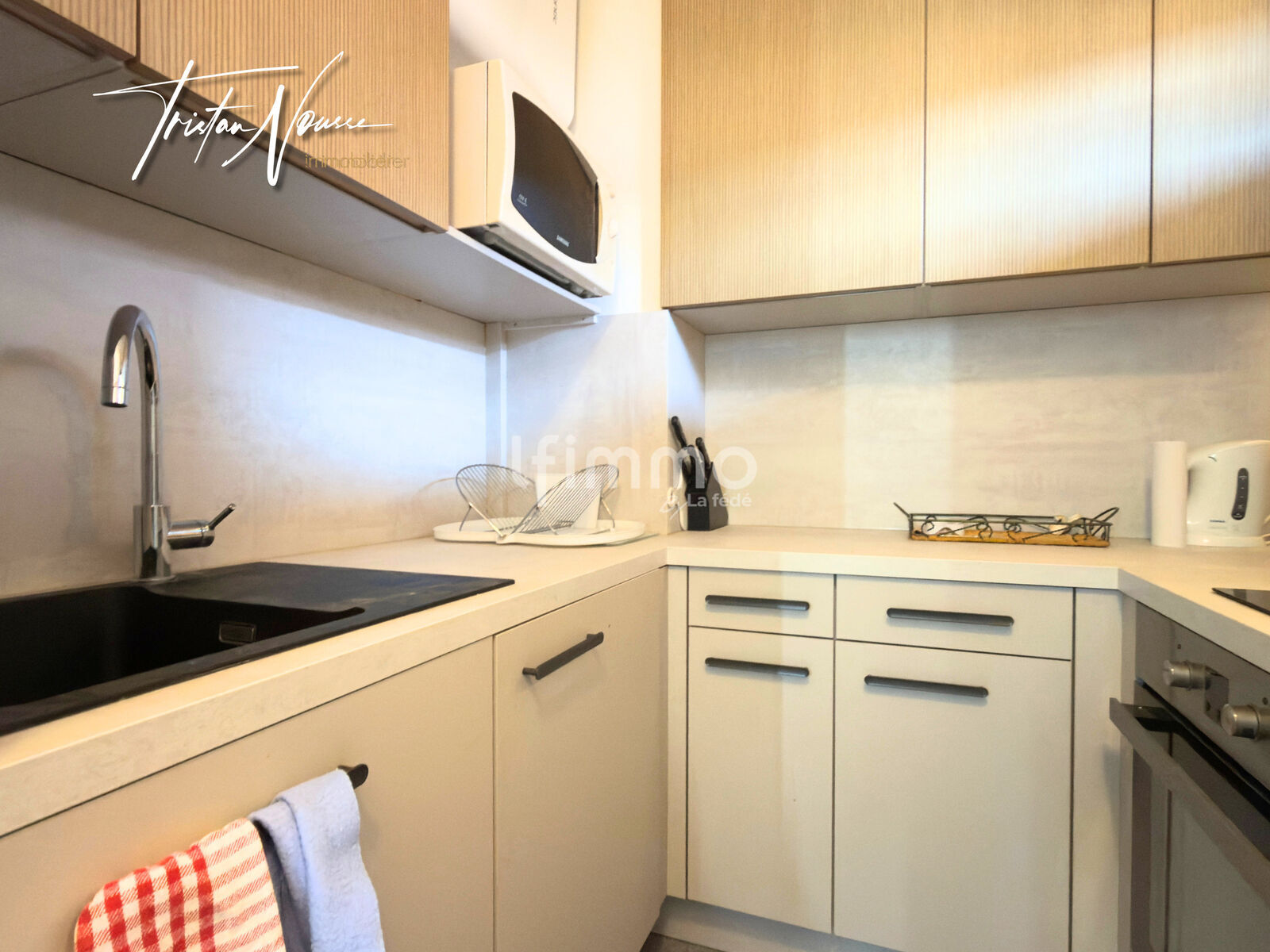 L'appartement se compose d'une entrée, séparant à droite une cuisine de 3 m2entièrement refaite par une entreprise locale, et à gauche, une salle d'eau de 3 m2avec WC partiellement refaite aussi par la même entreprise. Ensuite, vous accédez à une pièce de vie de 17 m2 donnant sur la loggia de 3,5 m2 avec une vue fantastique sur la Madeloc et un petit bout de mer.