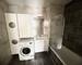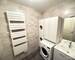 La salle de bain dispose d'une baignoire, une vasque, un meuble sous vasque. Un miroir et un meuble de rangement ainsi qu’un sèche serviettes électrique.
