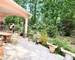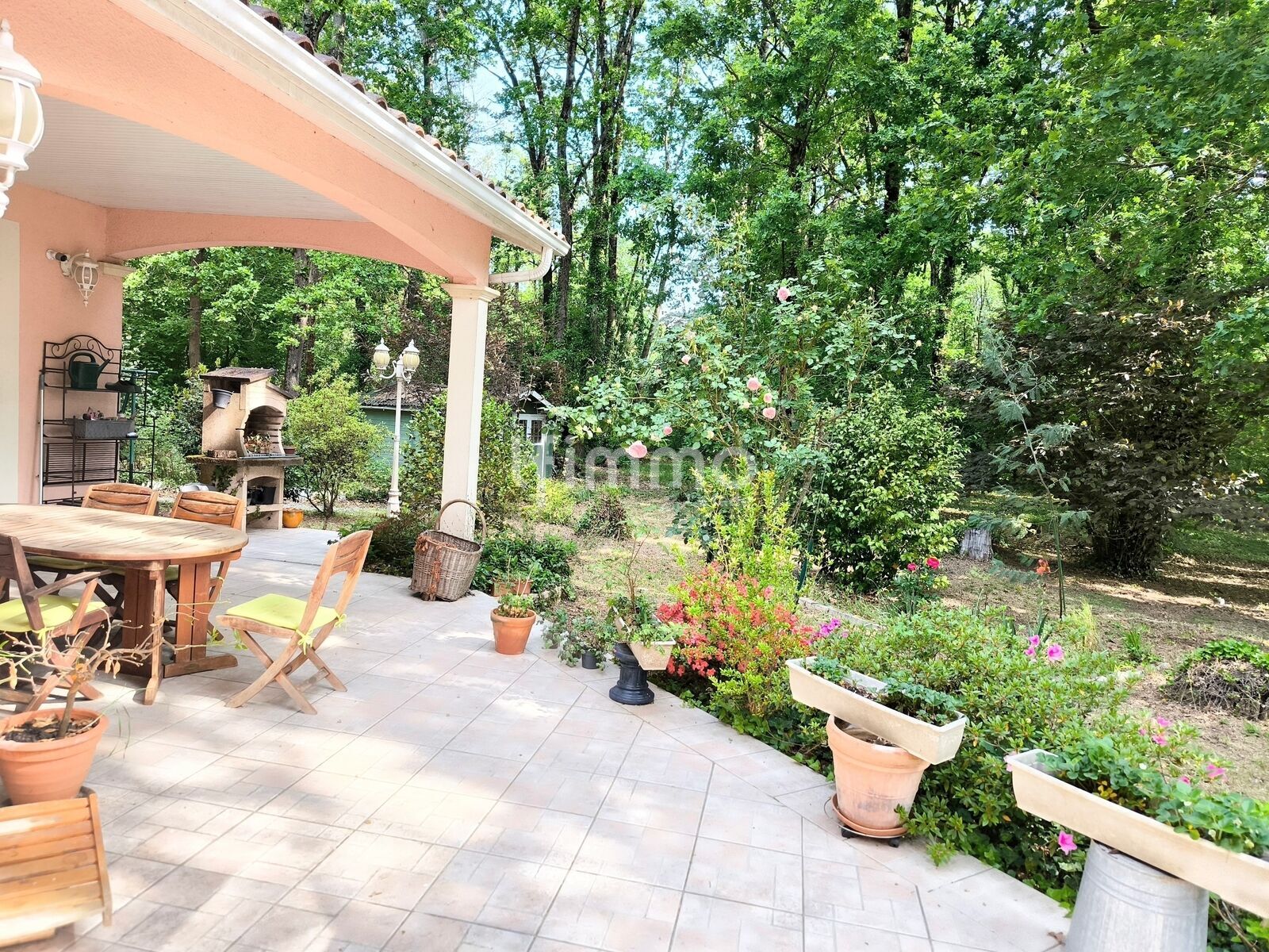 La maison s’ouvre sur une terrasse couverte où il fait bon profiter des journées ensoleillées, avec une vue dégagée sur l’environnement boisé qui entoure la propriété.
