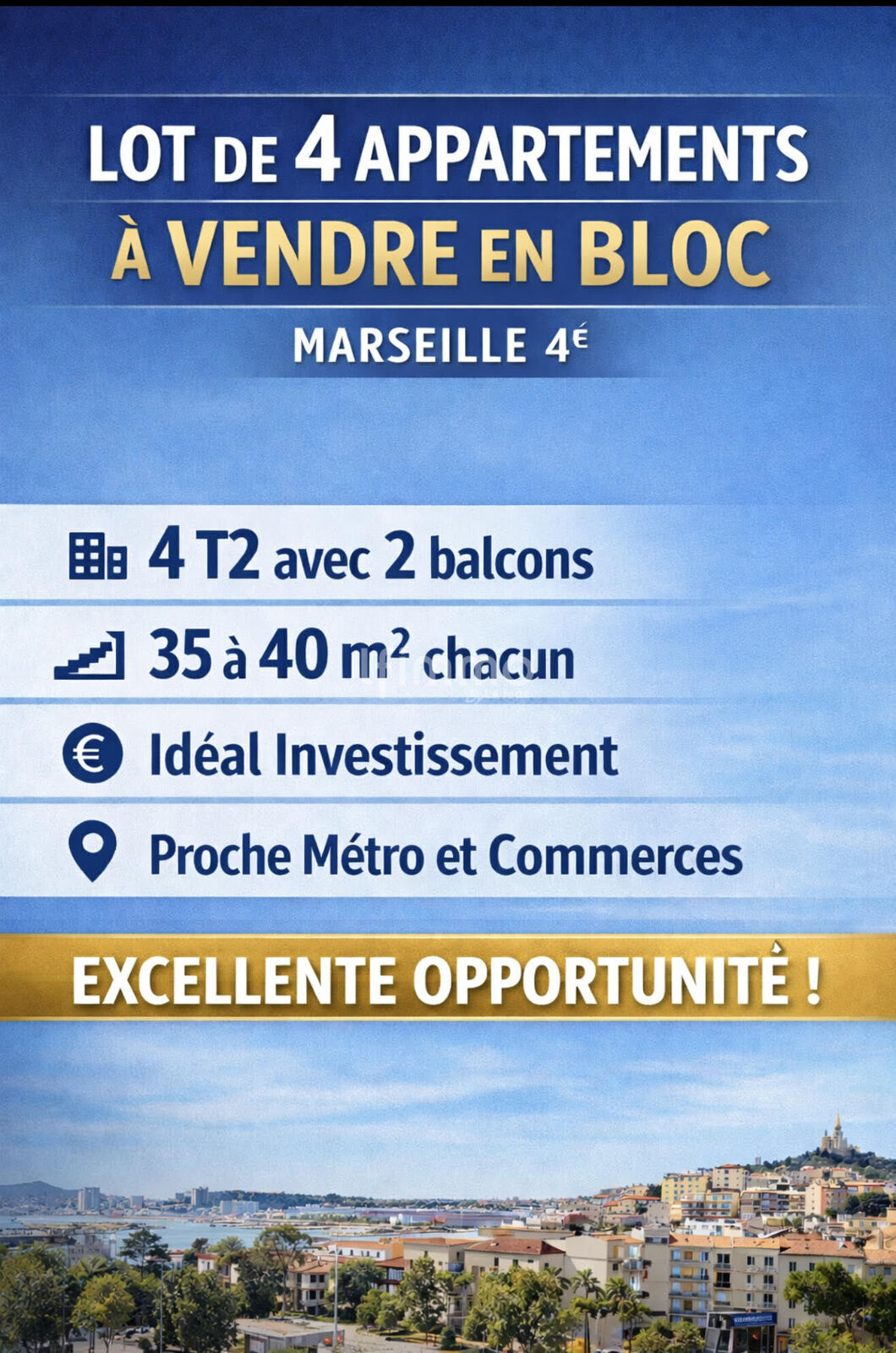C’est dans le quatrième arrondissement de Marseille que se situe ce lot de quatre appartements deux pièces, chacun avec deux balcons.