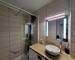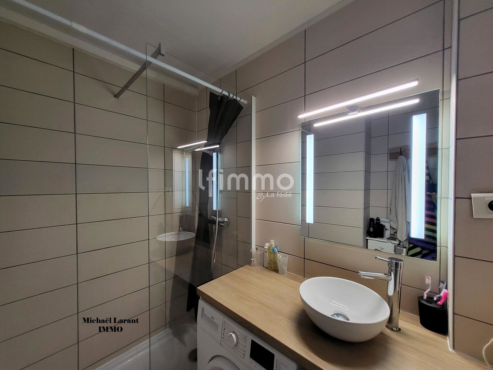 Une salle d’eau avec douche italienne et meuble simple vasque.