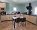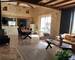 La pièce de vie de 69m², baignée de lumière, séduit par ses poutres apparentes, sa hauteur sous plafond et son poêle à bois, créant une atmosphère chaleureuse et élégante.