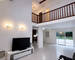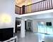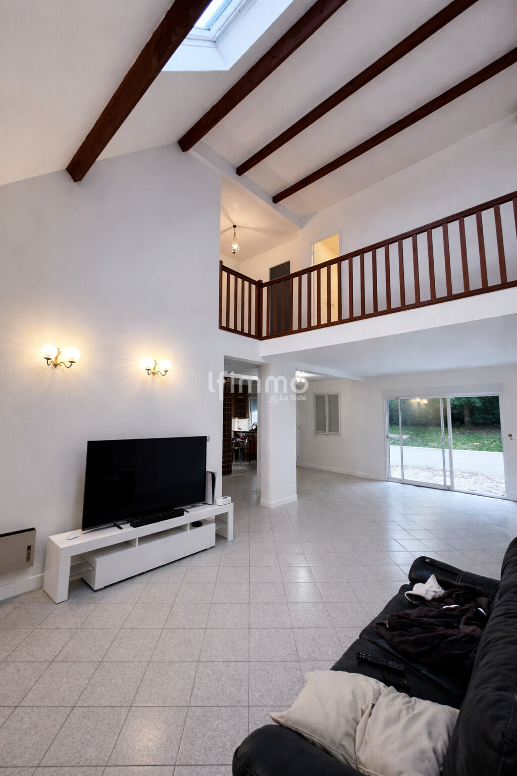 Le salon est une pièce cathédrale, offrant une belle hauteur sous plafond ayant accès à une grande baie vitrée donnant sur une terrasse de 35 m² puis un jardin avec vue sur le parc des coudraies, sans vis-à-vis.