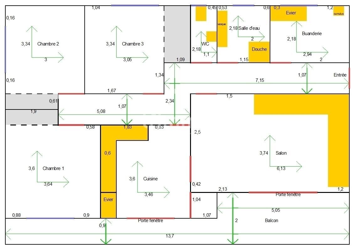 Salon : ~23 m² avec accès balcon (13,7 m²)