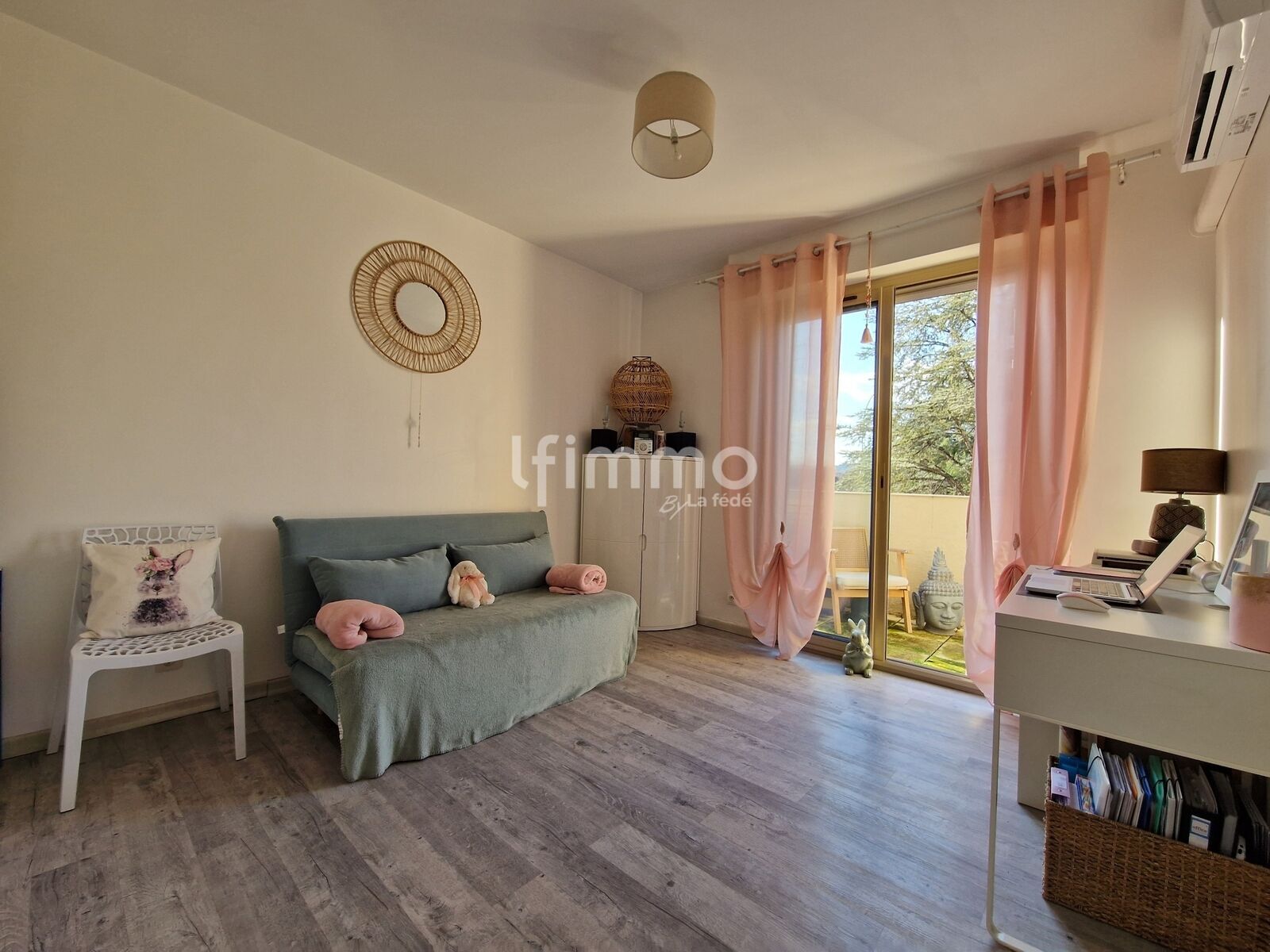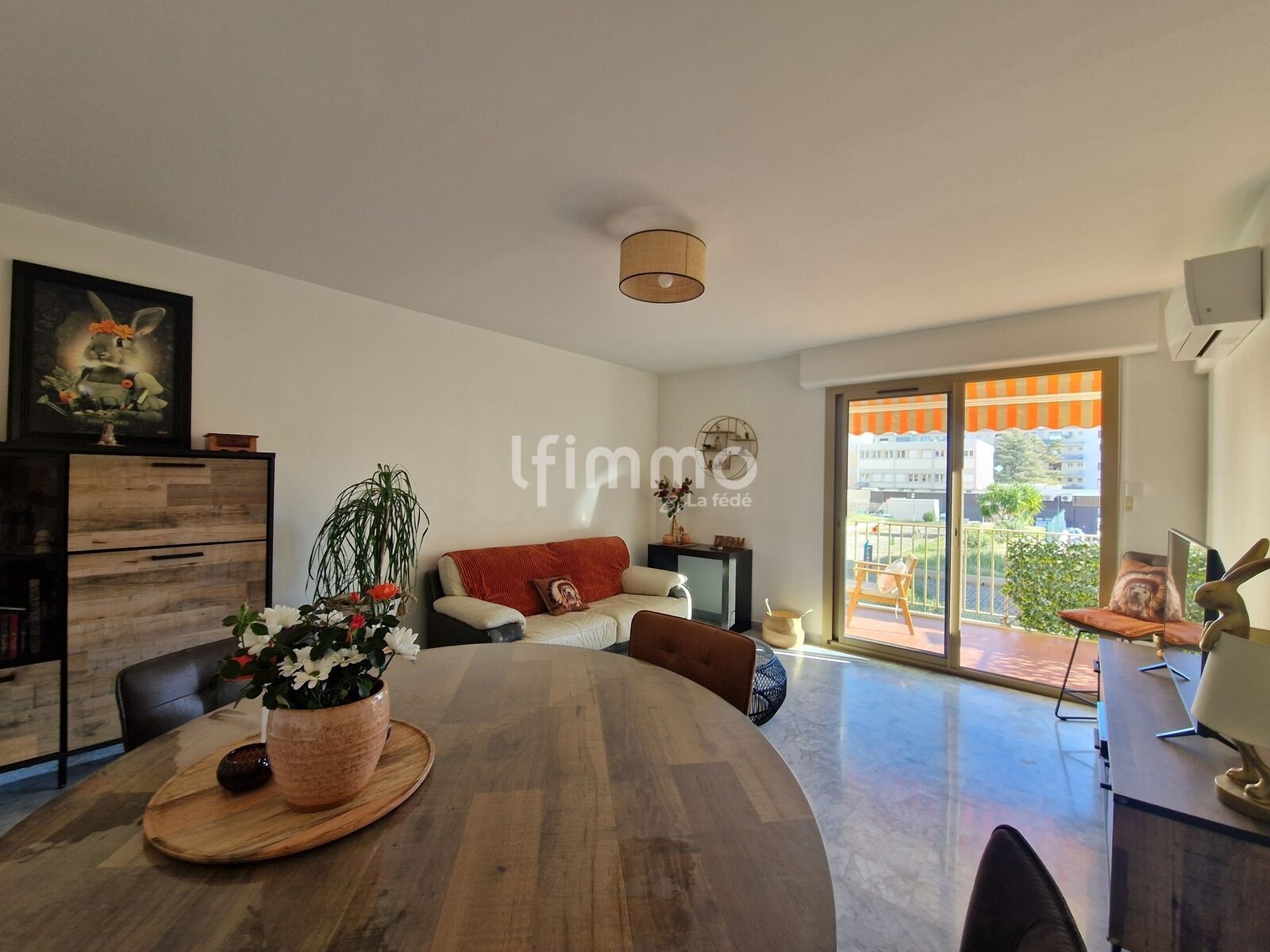 Le séjour lumineux s’ouvre sur une terrasse, parfaite pour profiter des moments de détente en plein air.