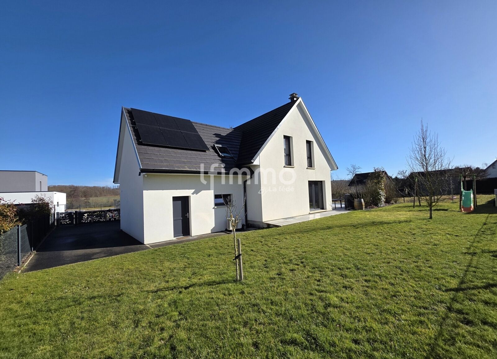 Derrière son beau portail coulissant et motorisé, cette maison contemporaine en demi-niveaux, construite en 2016, dispose d’une surface totale d'environ 149 m², dont 122 m² habitables. Elle séduit immédiatement par sa luminosité omniprésente, son excellente isolation, son mode de chauffage efficace et ses quatre chambres, idéales pour une famille.