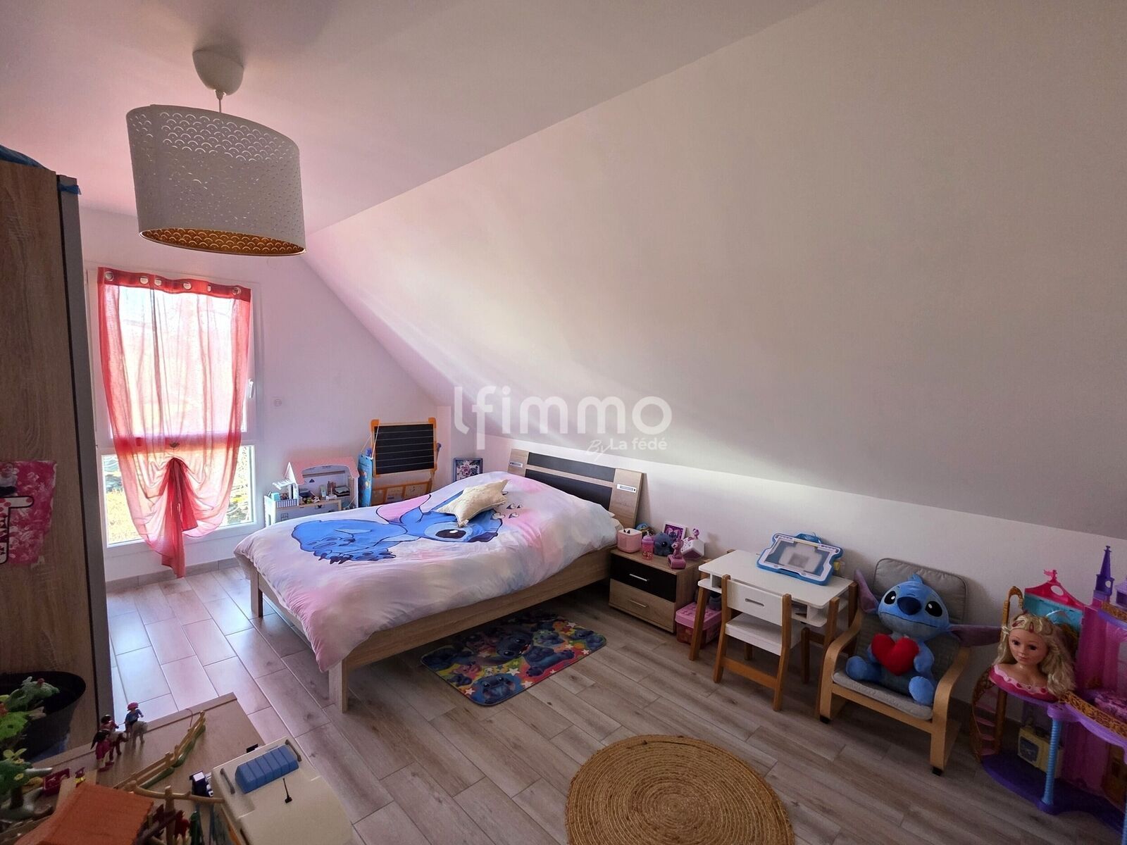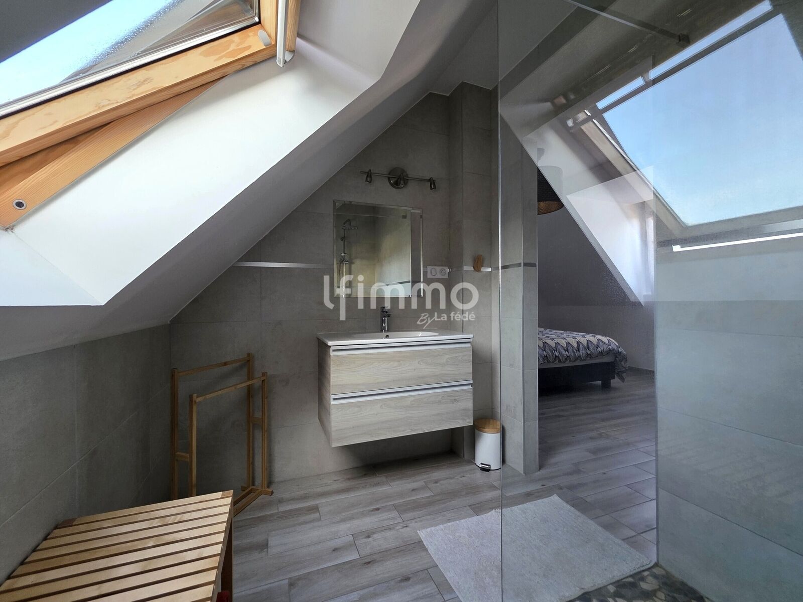 Quelques marches mènent à la suite parentale, véritable cocon, disposant de son dressing et de sa salle d’eau privative équipée d’une douche à l’italienne. À l’étage, l’espace nuit se compose d’un dégagement avec placard, de trois chambres supplémentaires, d’une salle de bain familiale avec baignoire d’angle et trappe à linge, ainsi que de toilettes indépendants. Les combles isolés offrent un espace de stockage complémentaire particulièrement appréciable.