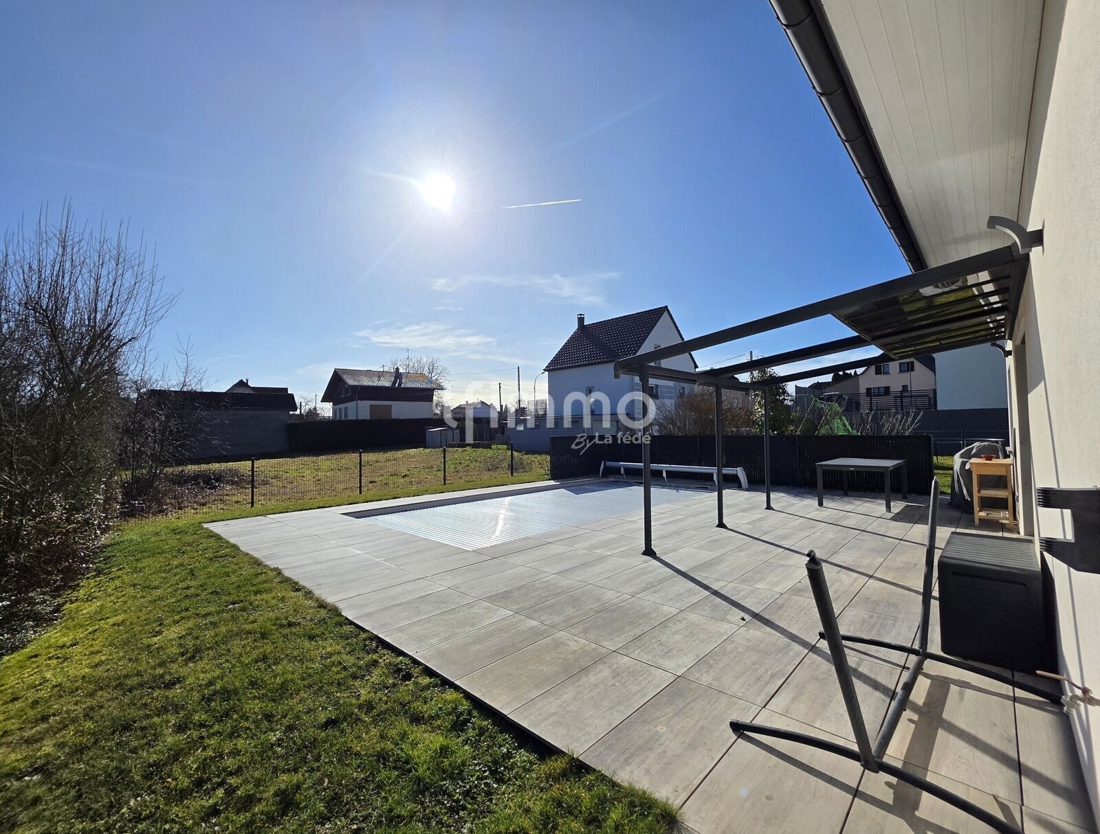 À l’extérieur, la terrasse, la pergola et la piscine chauffée de 8 × 3,80 m, équipée d’un volet électrique installé en 2022, promettent de véritables moments de détente durant la belle saison. L’ensemble est implanté sur près de 7 ares de terrain entièrement clos et paysagé, offrant un cadre sécurisé et agréable.