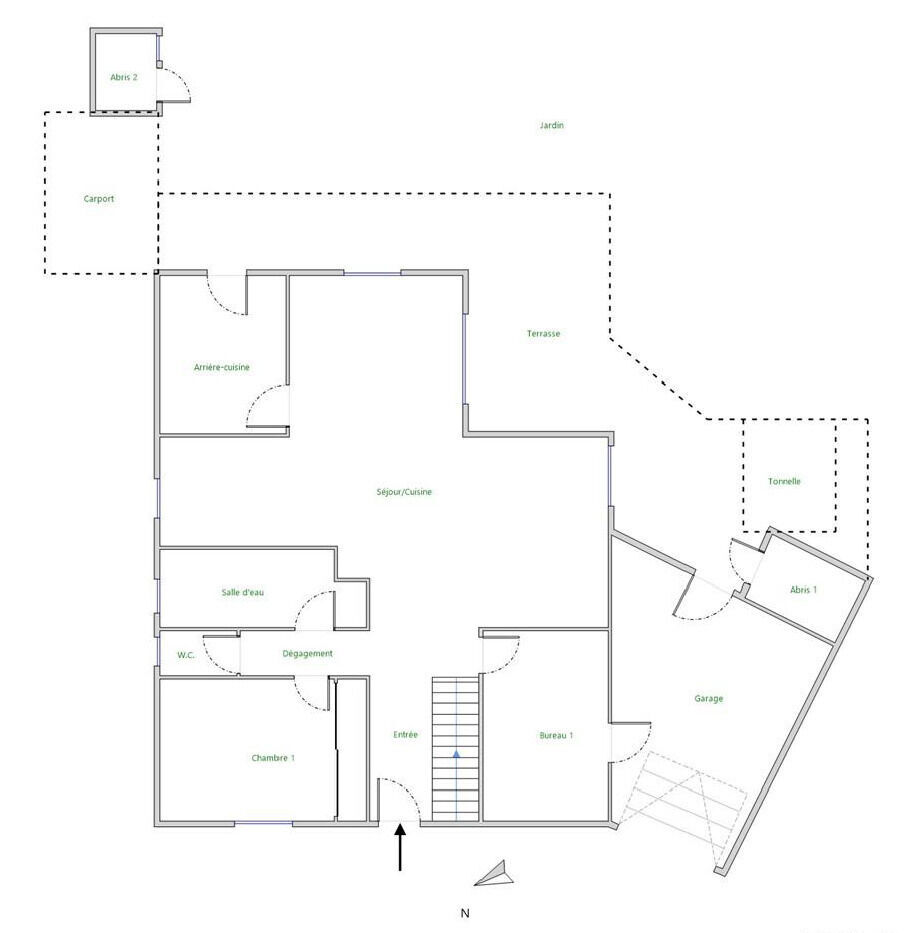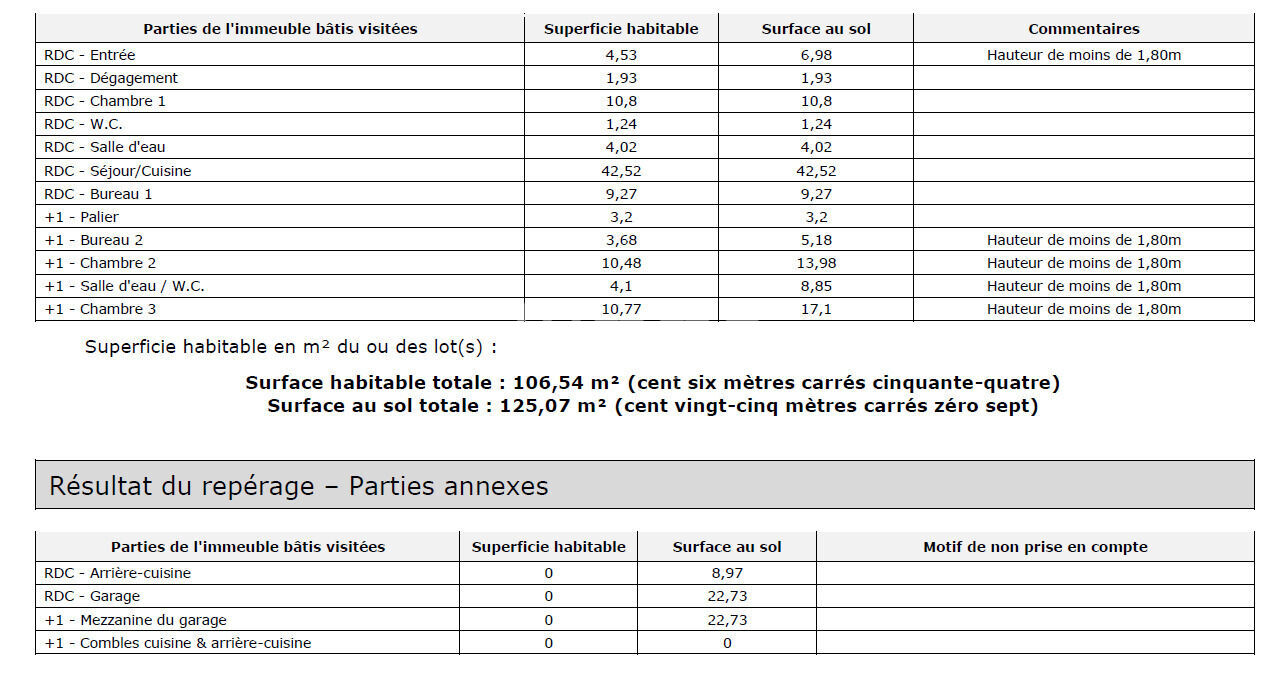 106 m² hab. / 125 m² au sol — Terrain 585 m² — 4 chambres + bureau — Pièce de vie 42 m² — 2 SDE — 2 WC — Arrière-cuisine 8,97 m² et Garage 22 m² (en supplément des surfaces annoncées) — Carport — Abris de jardin — Chauffage gaz.