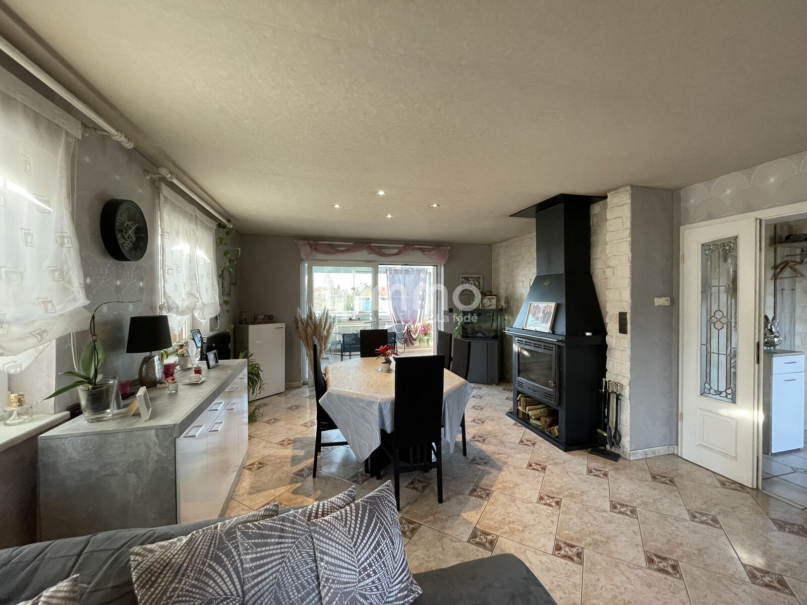 - RDC : dégagement, grand salon/salle à manger avec accès à une véranda, cuisine équipée (cuisinière et hotte Godin), cellier, bureau, buanderie, WC, accès à une vaste terrasse.