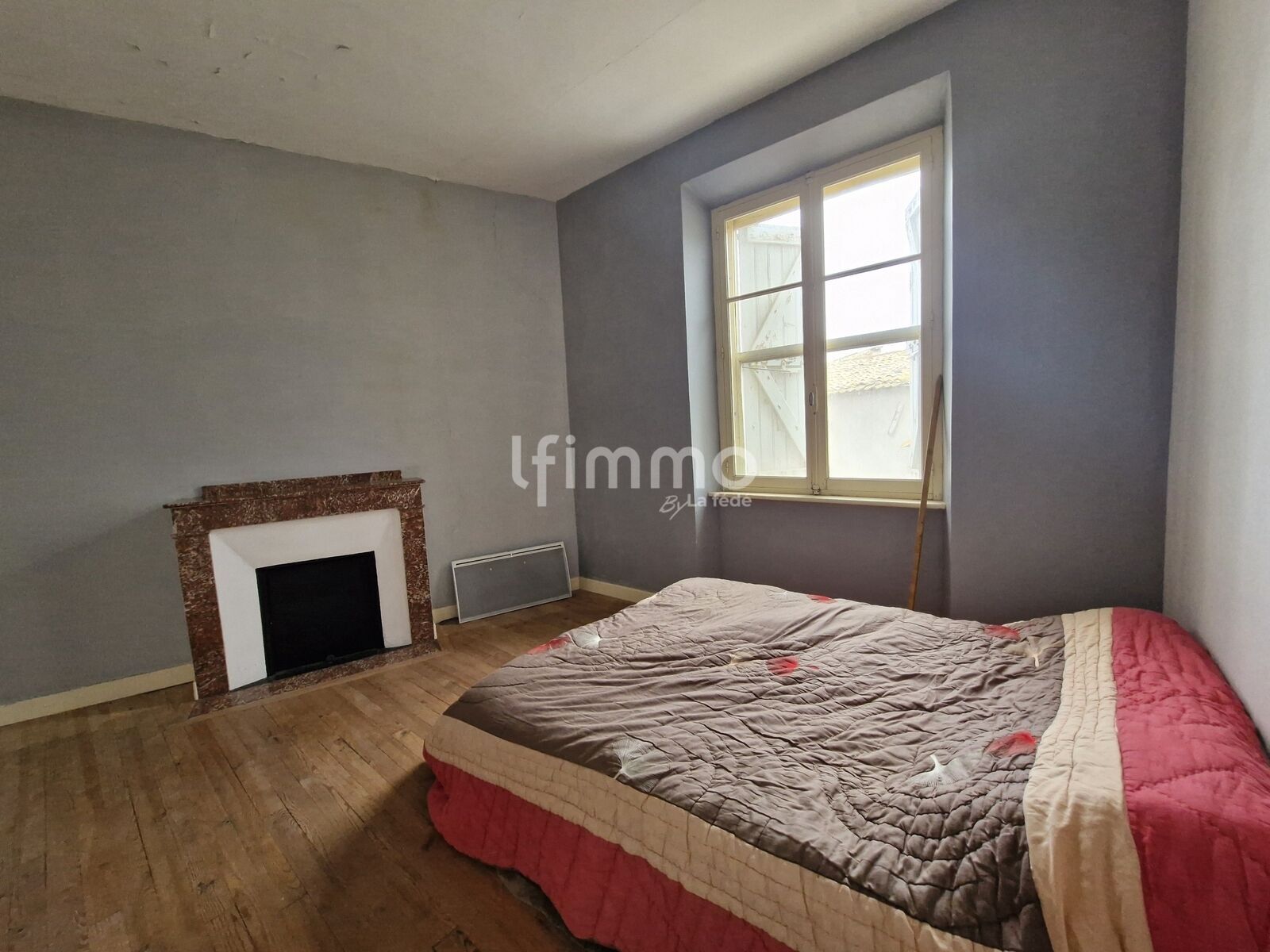 Chambre 4 de 18,54m² environ avec une cheminée. Sol issu de parquet en bois. Fenêtre en menuiserie bois, simple vitrage, avec volet en bois, et moustiquaire.