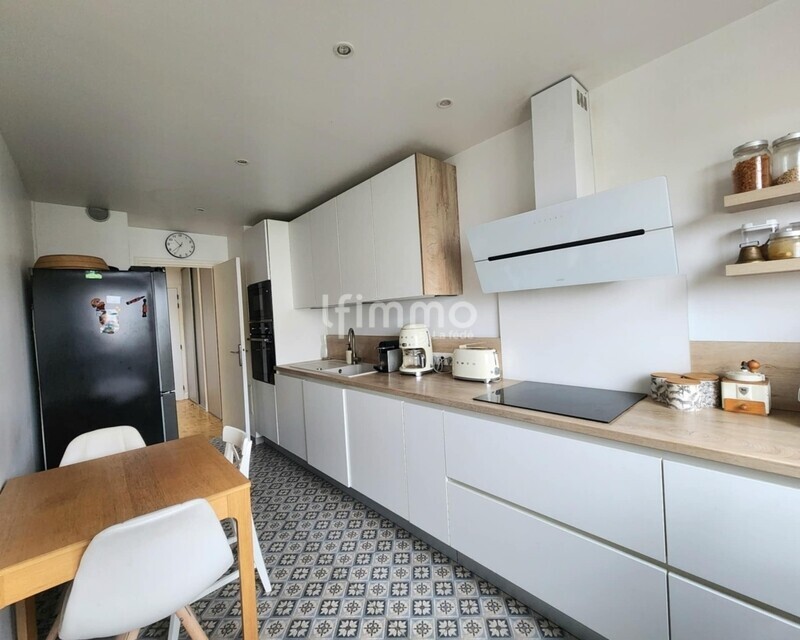 Dans la continuité, une cuisine dinatoire de 11 m², aménagée et équipée, ainsi qu’un séjour/salon de 28 m² (avec possibilité de créer une chambre supplémentaire), donnant accès à un balcon de 5 m².
