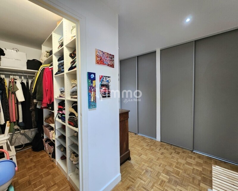 Dès l’entrée, vous découvrirez une spacieuse entrée avec deux grands placards, ainsi qu’un dressing entièrement aménagé de 3,50 m².