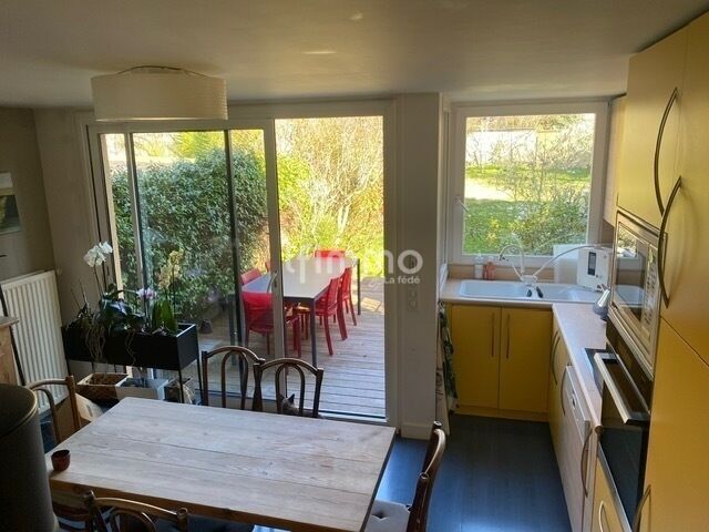Au premier étage, vous serez séduit par le salon/salle à manger de 40m2, traversant, avec son joli poêle et sa cuisine de 16m2 en contre bas donnant sur la terrasse et le jardin sans vis à vis( possibilité de fermer la cuisine).