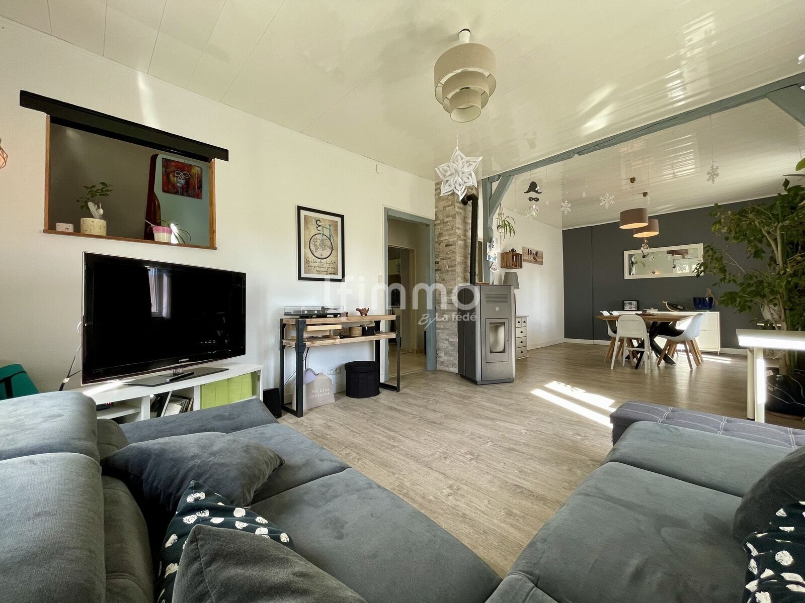 Vous trouverez au rez-de-chaussée une double pièce de vie, où le poêle à pellets réchauffera les corps et les coeurs. La cuisine se veut spacieuse et fonctionnelle, elle bénéficie par ailleurs d'un accès à la terrasse abritée. Une chambre se situe également au RDC.