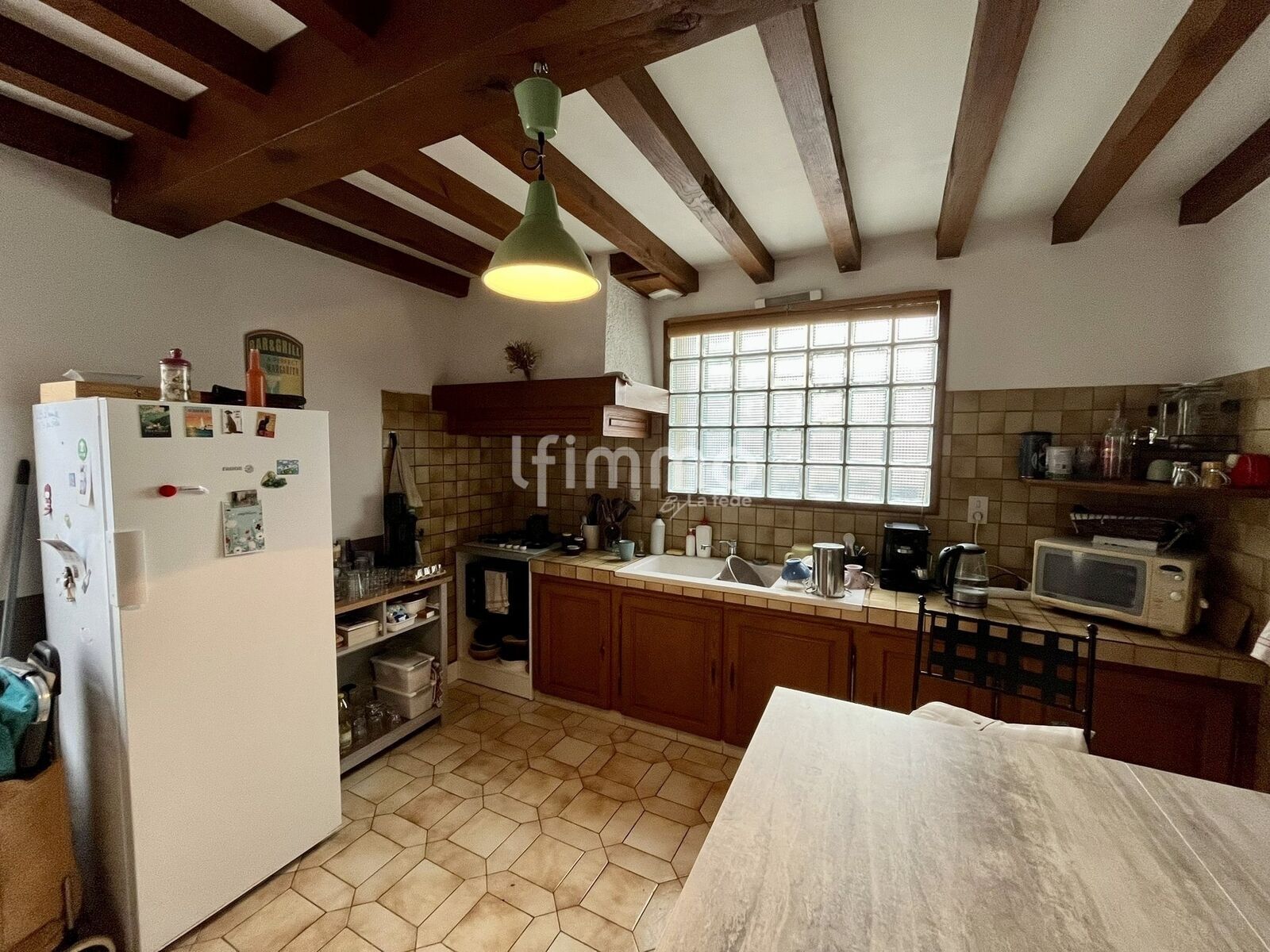 Les espaces de vie comprennent une cuisine d’environ 15 m² et un séjour salle à manger d’environ 30 m² avec cheminée, qui apporte un chauffage complémentaire aux radiateurs électriques récents installés dans la maison.