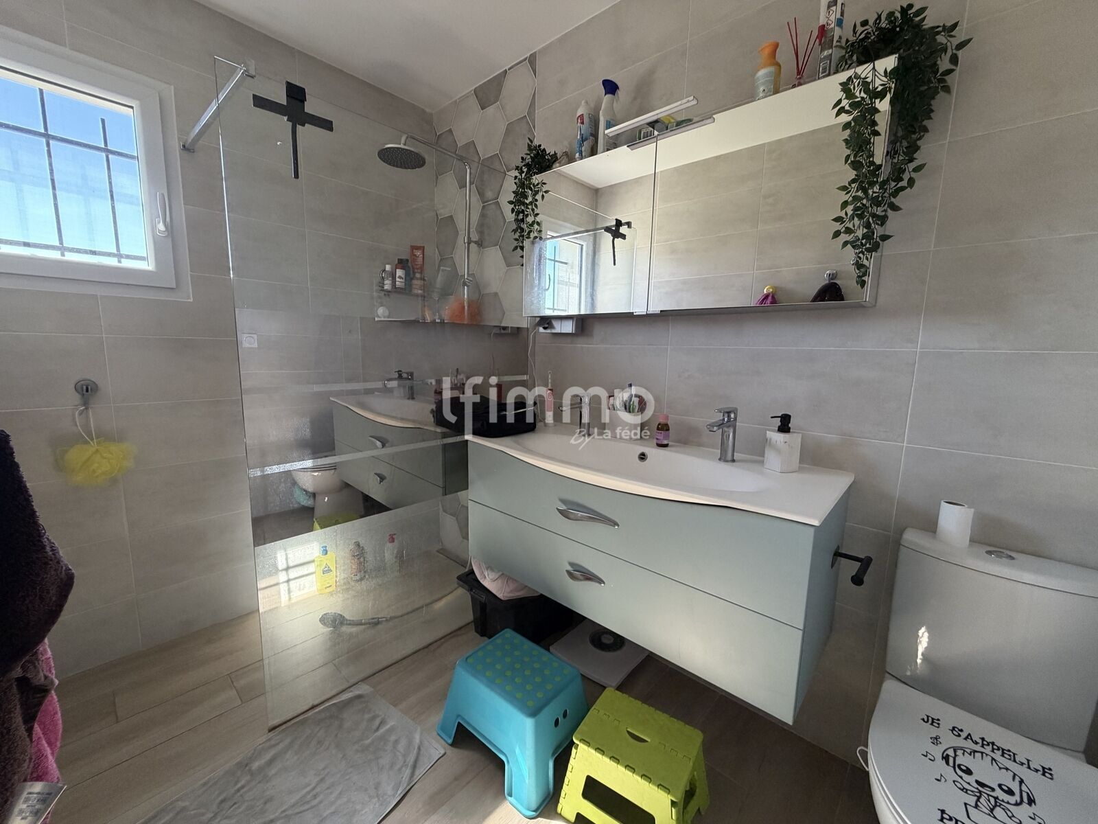 Vous trouverez également une salle de bain moderne équipée d’une douche à l’italienne et d’une double vasque, ainsi qu’un toilette indépendant.