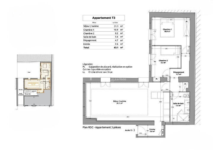 Il se compose d’une entrée, d’un bel espace de vie de 31 m², de 2 chambres et d’une salle d’eau avec WC.