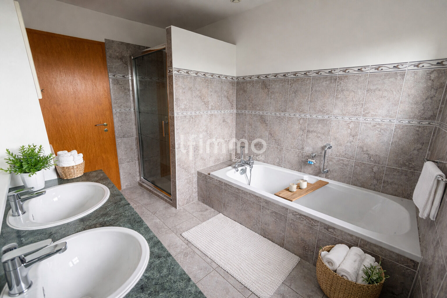 • Une salle de bain complète avec douche, baignoire et double vasque