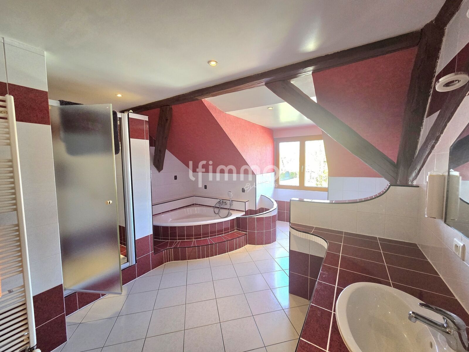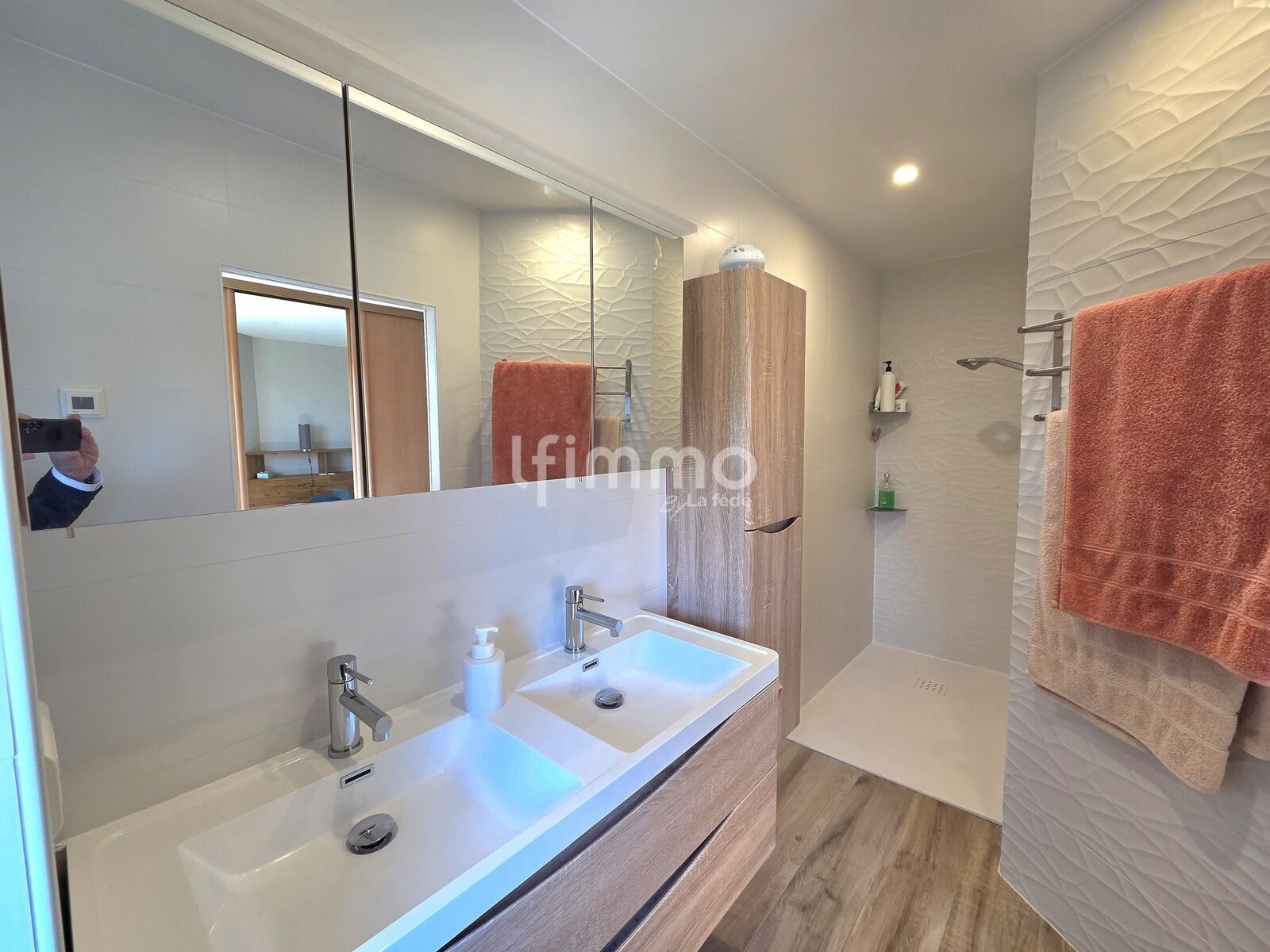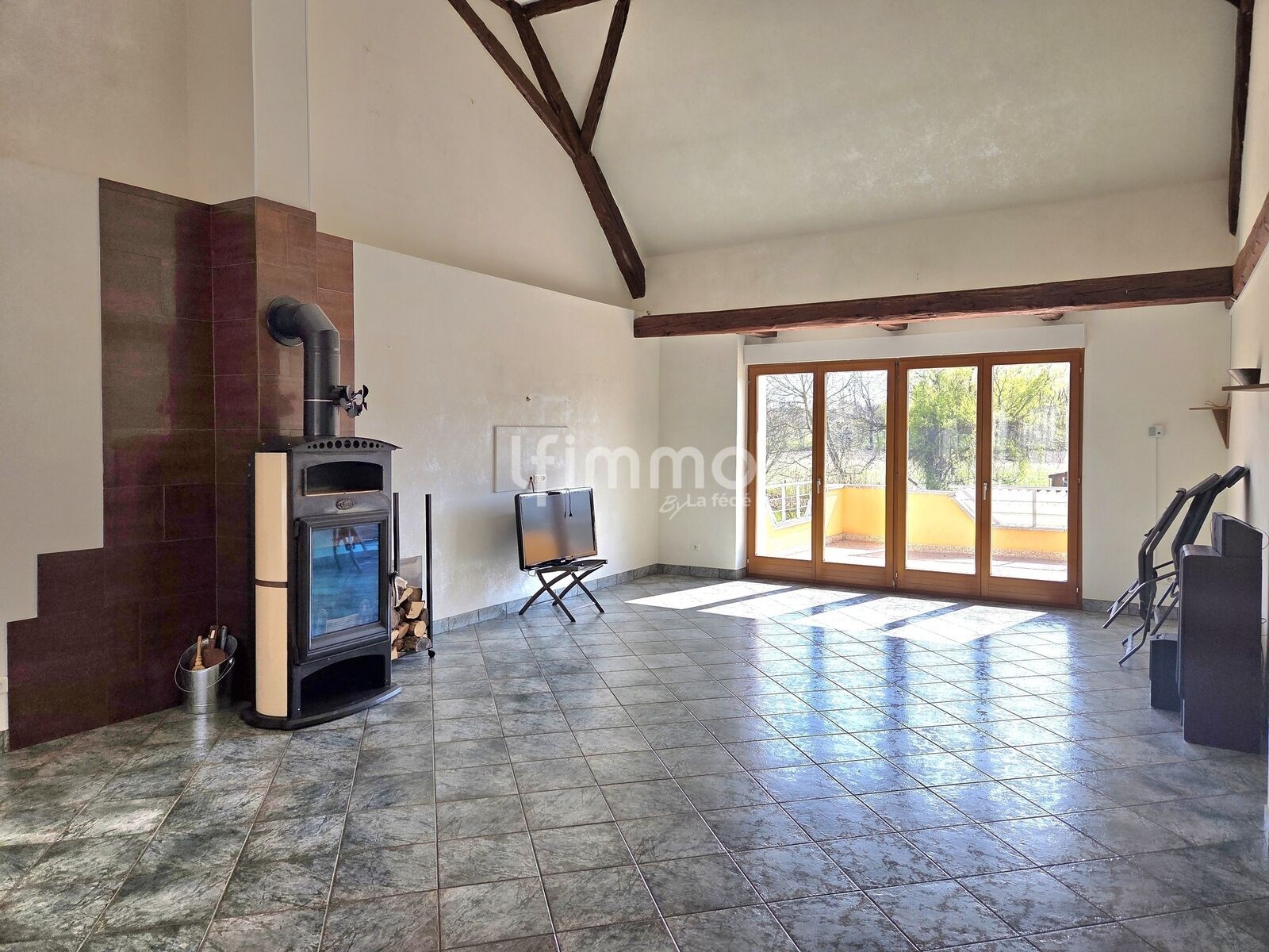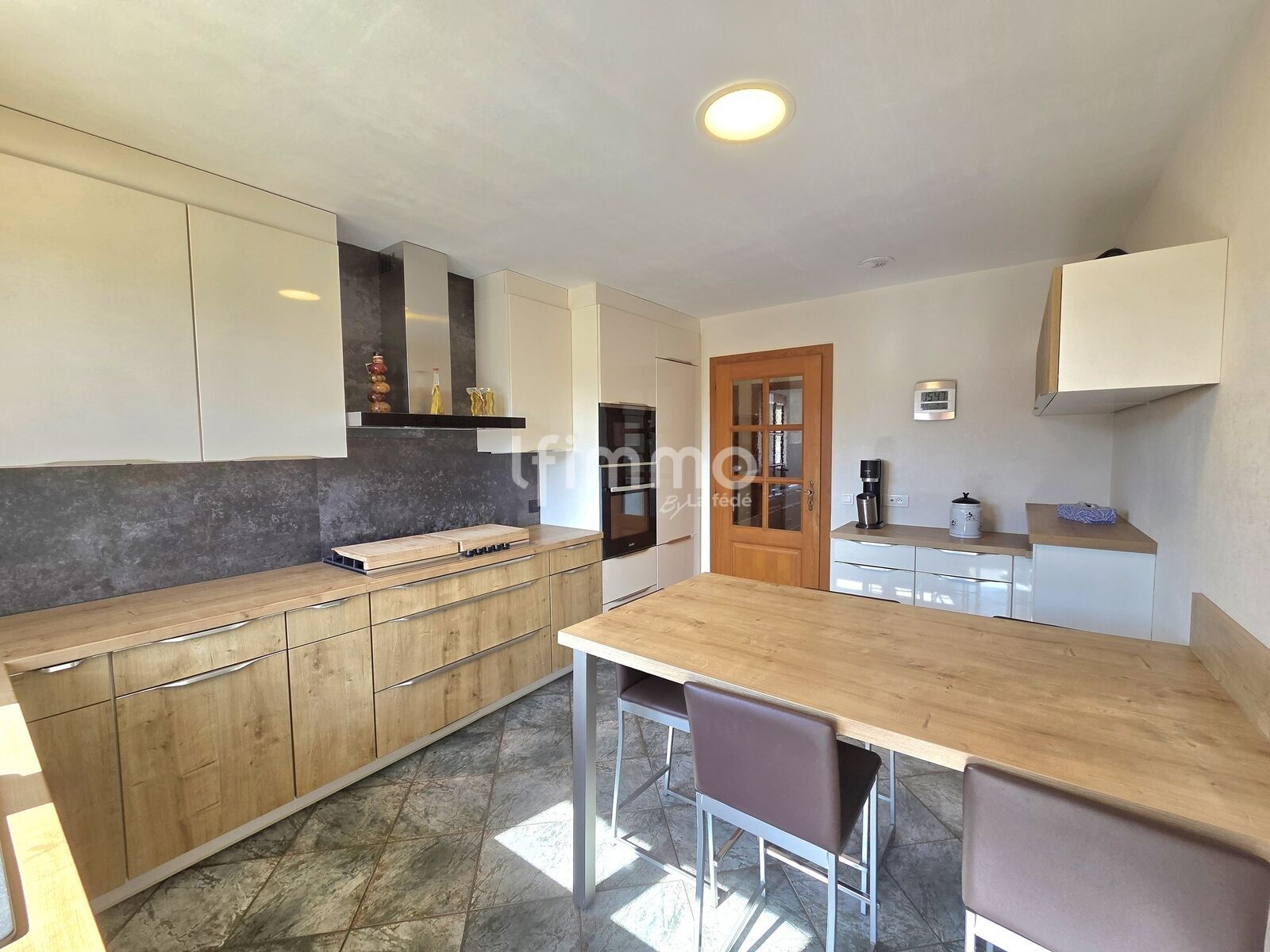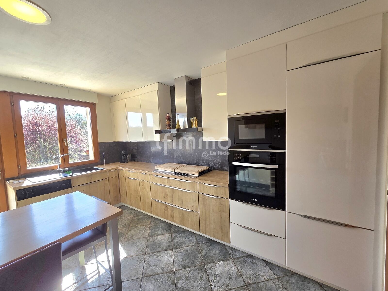 Au rez-de-chaussée, vous découvrirez un superbe salon-séjour avec toit cathédrale, baigné de lumière, ainsi qu’une cuisine fonctionnelle avec accès direct à la terrasse.