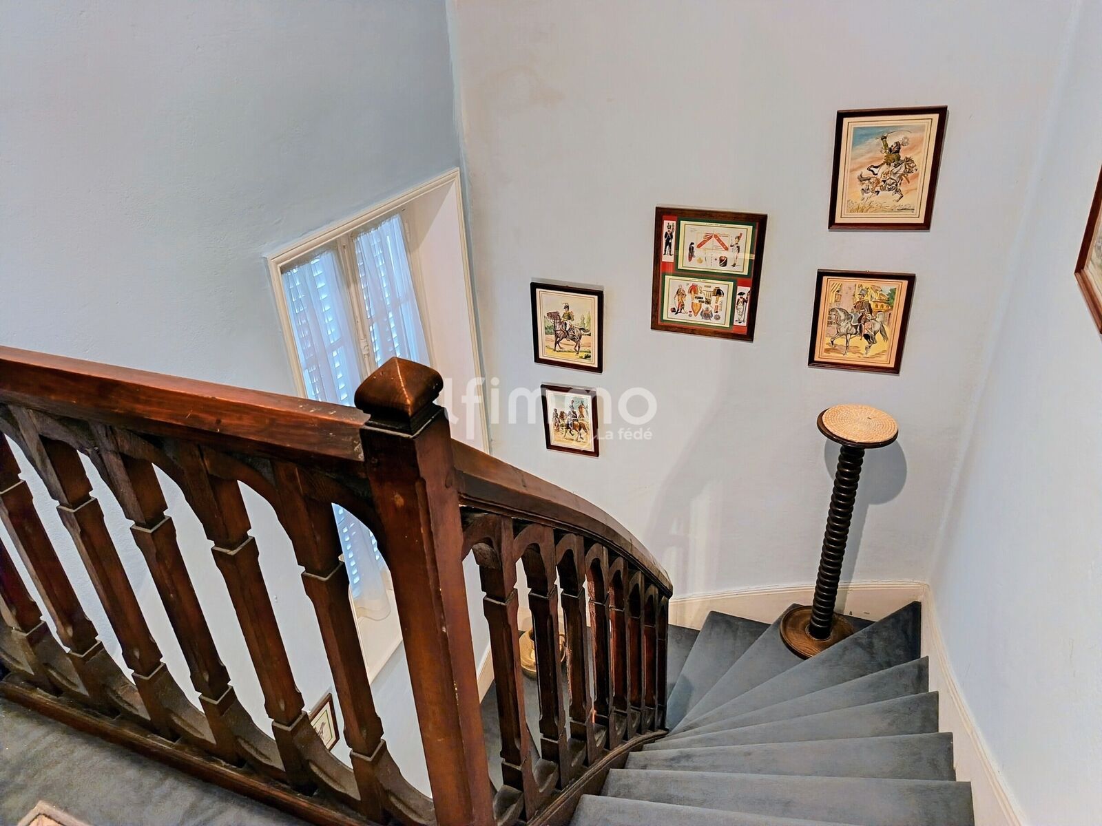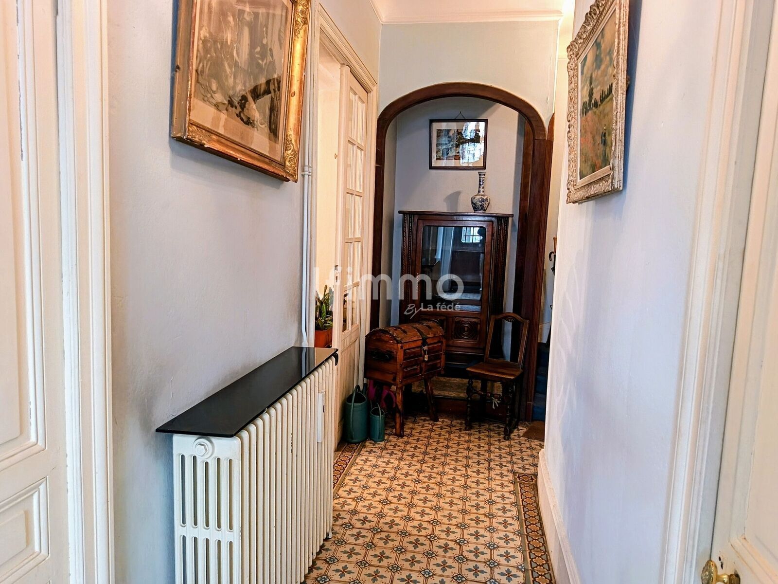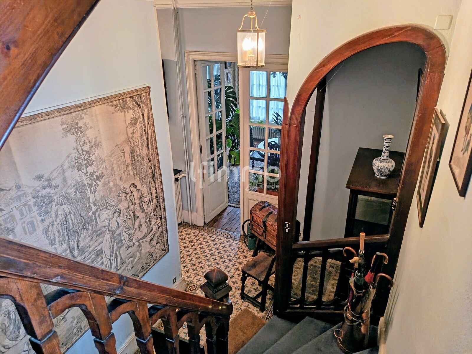 La haute porte d'entrée peut s'ouvrir partiellement grâce à une ferronnerie astucieuse. De beaux carreaux de ciment ornent le couloir d'entrée. Les 3 niveaux d'habitation sont desservis par un magnifique escalier en stuc à rampe de bois monumentale et aux marches confortables à monter comme à descendre, le tout éclairé par de hautes fenêtres. Les radiateurs anciens en fonte diffusent une chaleur douce tout au long de la journée.