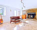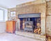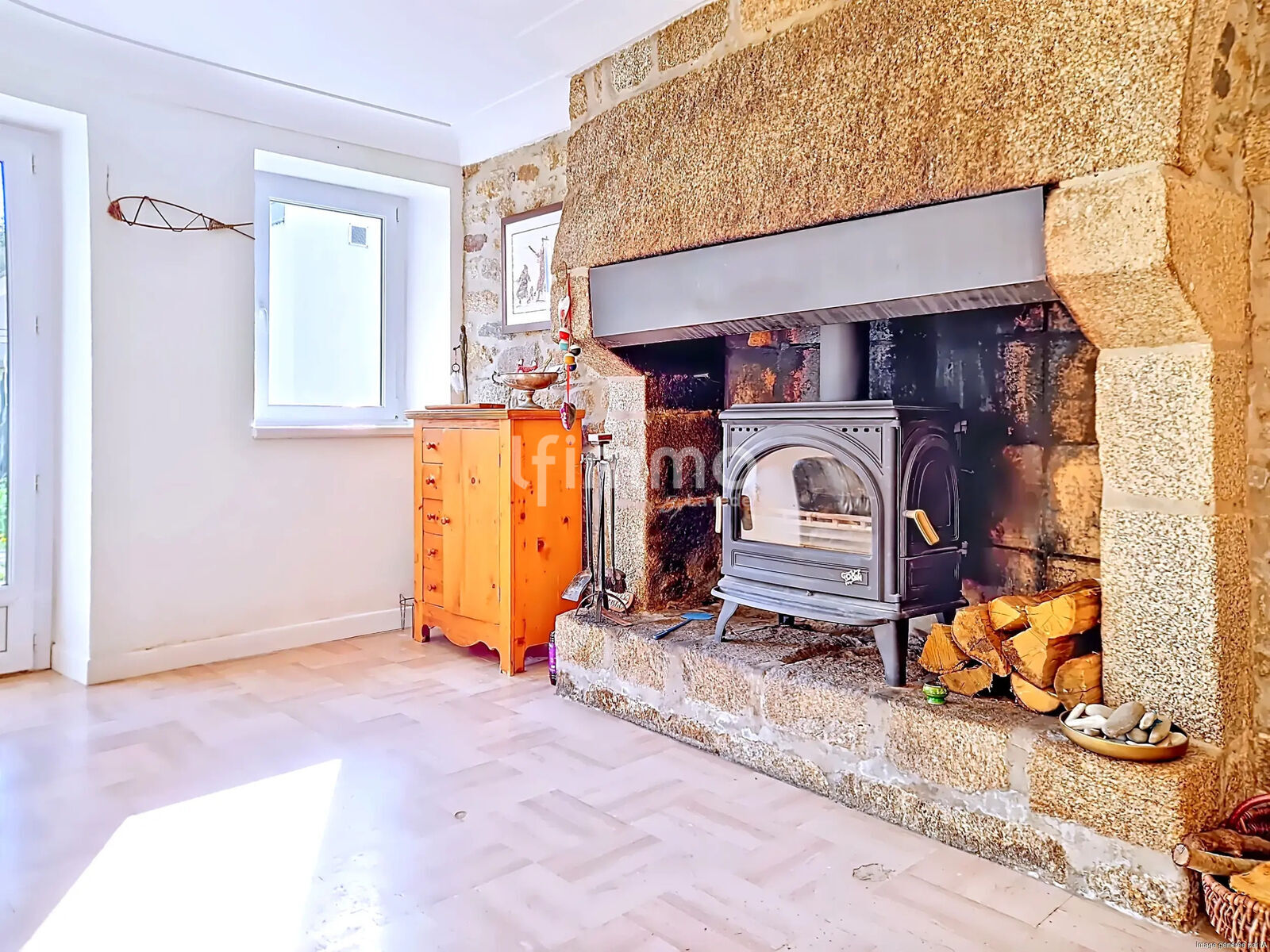 L’espace salon met en valeur une ancienne cheminée en pierre réhabilitée, équipée d’un poêle à bois en fonte labellisé Flamme verte, apportant une atmosphère chaleureuse et authentique.