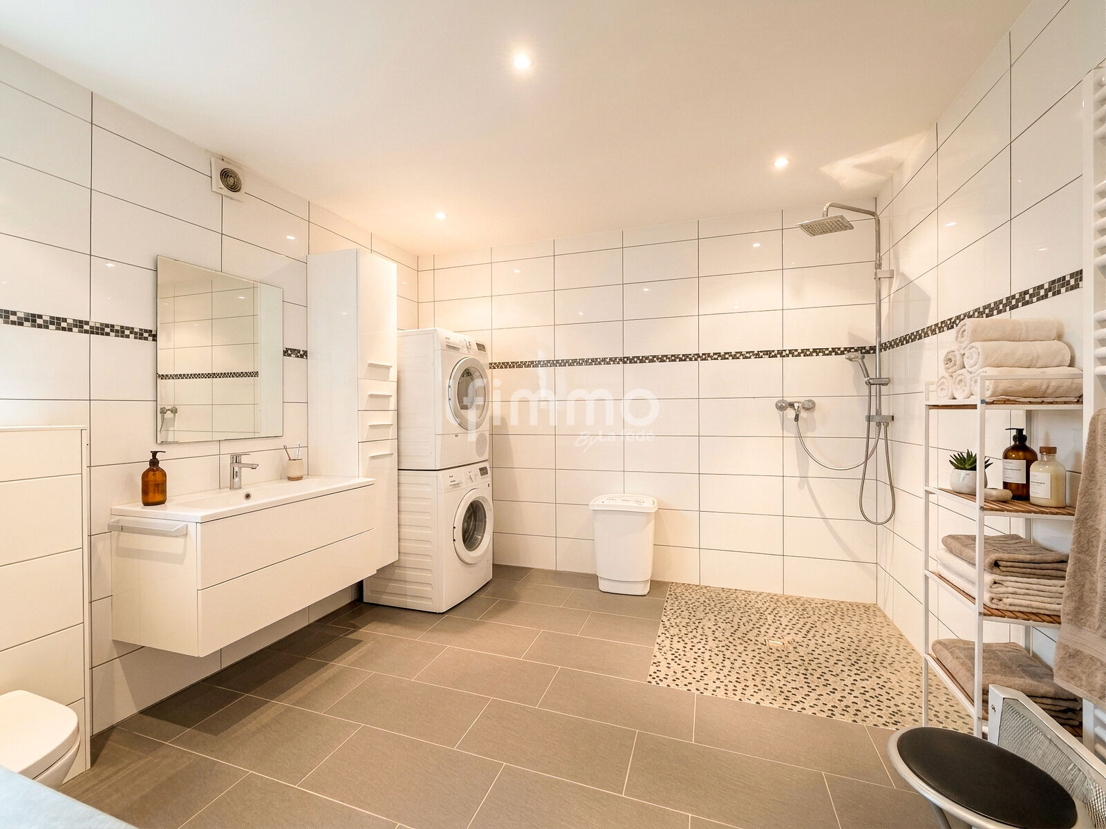 Une salle d'eau et douche à l'italienne, complétée par une buanderie fonctionnelle.