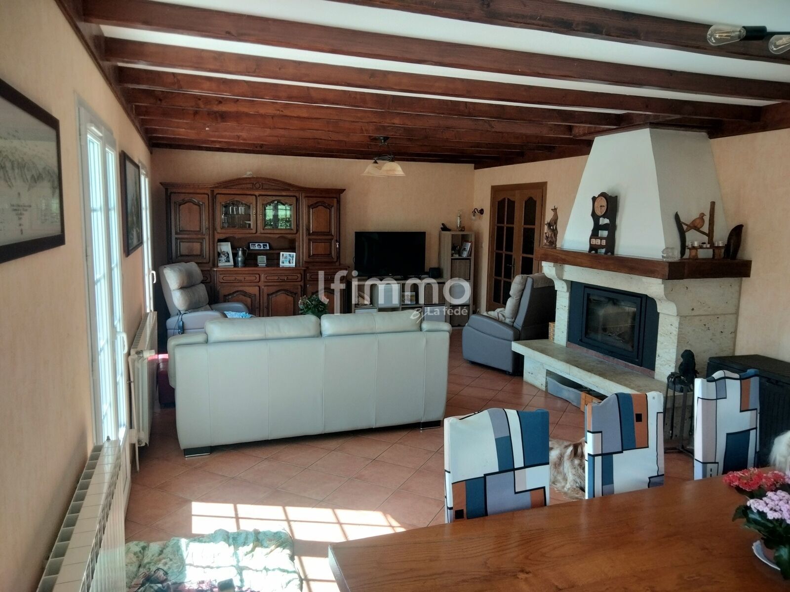 Le bien comprend cinq pièces principales dont quatre chambres, adaptées à une organisation familiale. Chaque niveau dispose d’une salle d’eau avec WC, facilitant ainsi la vie quotidienne. La cuisine est aménagée, fonctionnelle et intégrée à l’espace de vie. Un séjour avec cheminée constitue un espace convivial et chaleureux.